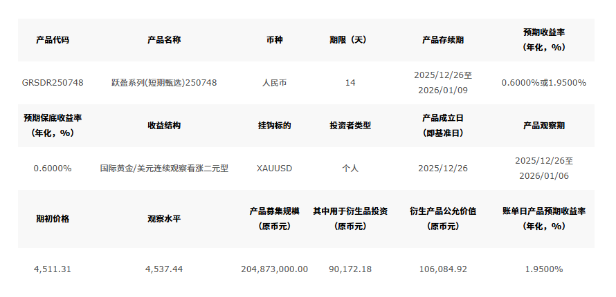 以中国银行(601988.SH)发布的跃盈系列(短期甄选)250748为参考,该产品约定14天期限,预期年化收益率0.6%或1.95%,收益结构为国际黄金/美元连续观察看涨二元型。
