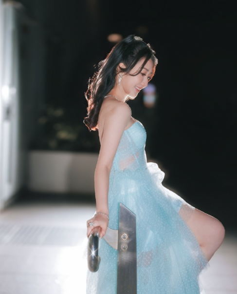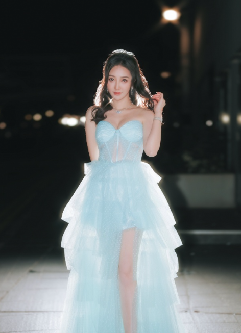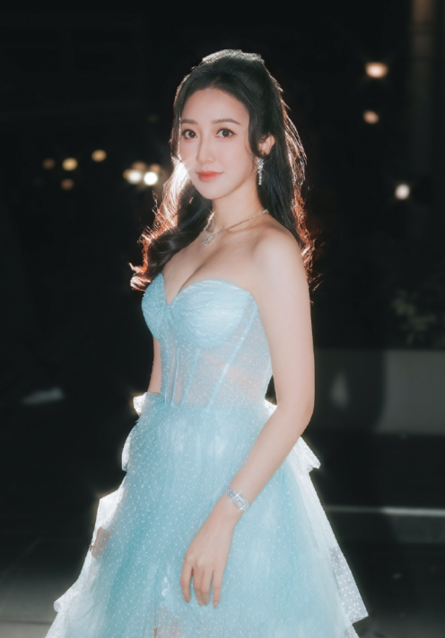 何依婷淡蓝抹胸裙,闪闪亮亮,优雅的港风女明星