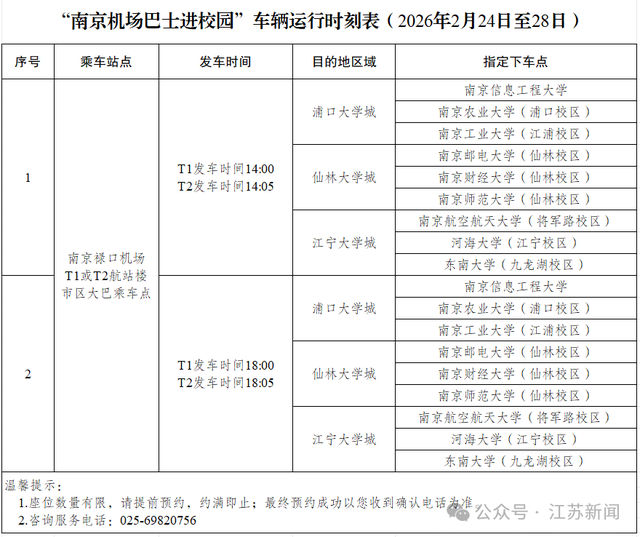 担心开春返校不方便?活动第二阶段已安排!2月24日至28日,南京机场T1、T2航站楼一楼乘车点,每日下午2个班次,免费送返校学生到大学城指定下车点,覆盖所有返乡时的校园站点,不用再为“最后一公里”发愁。