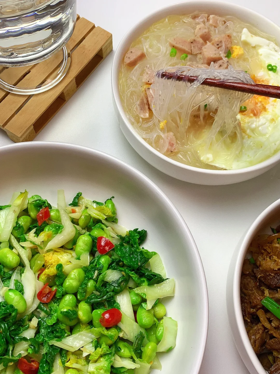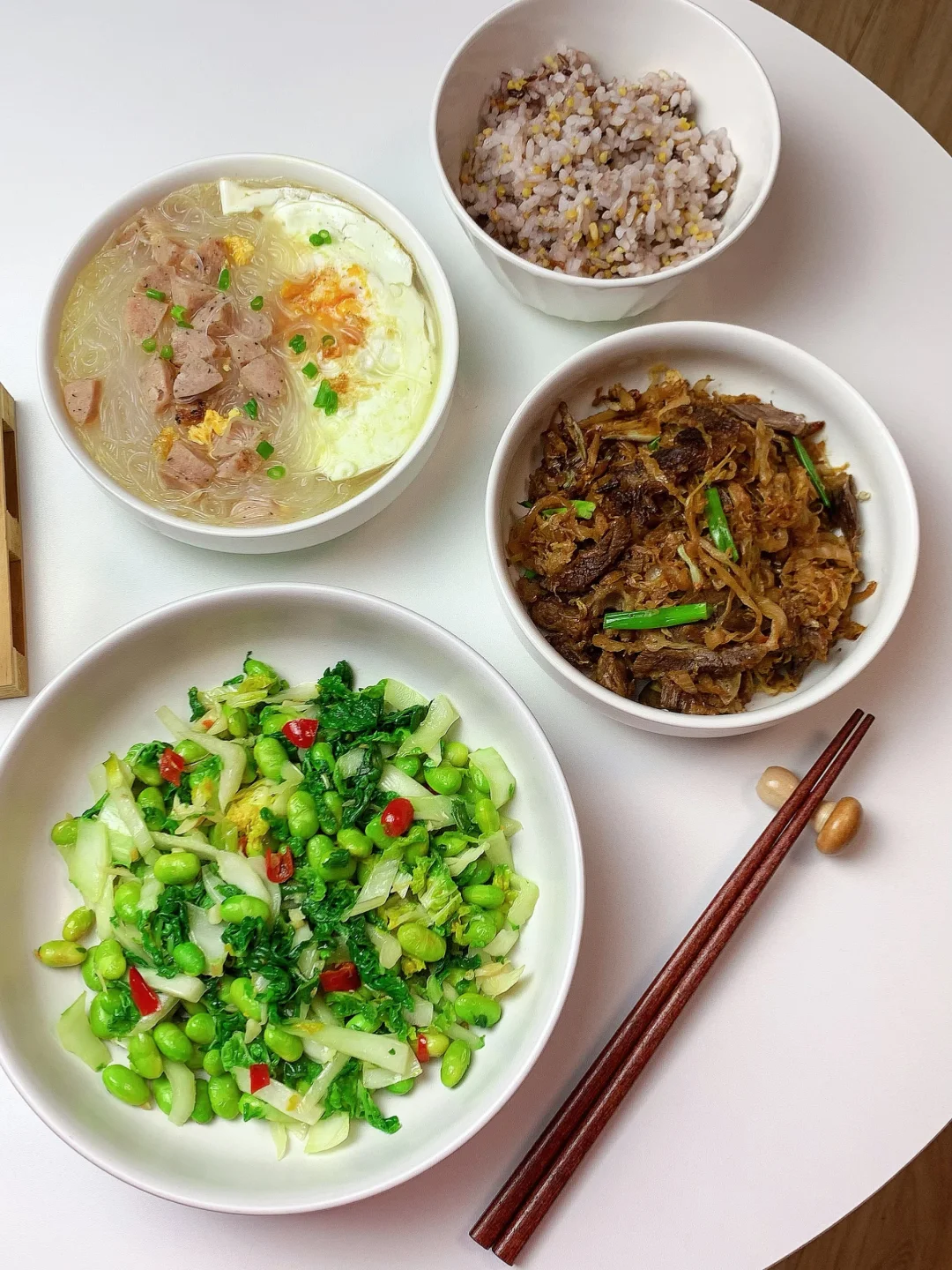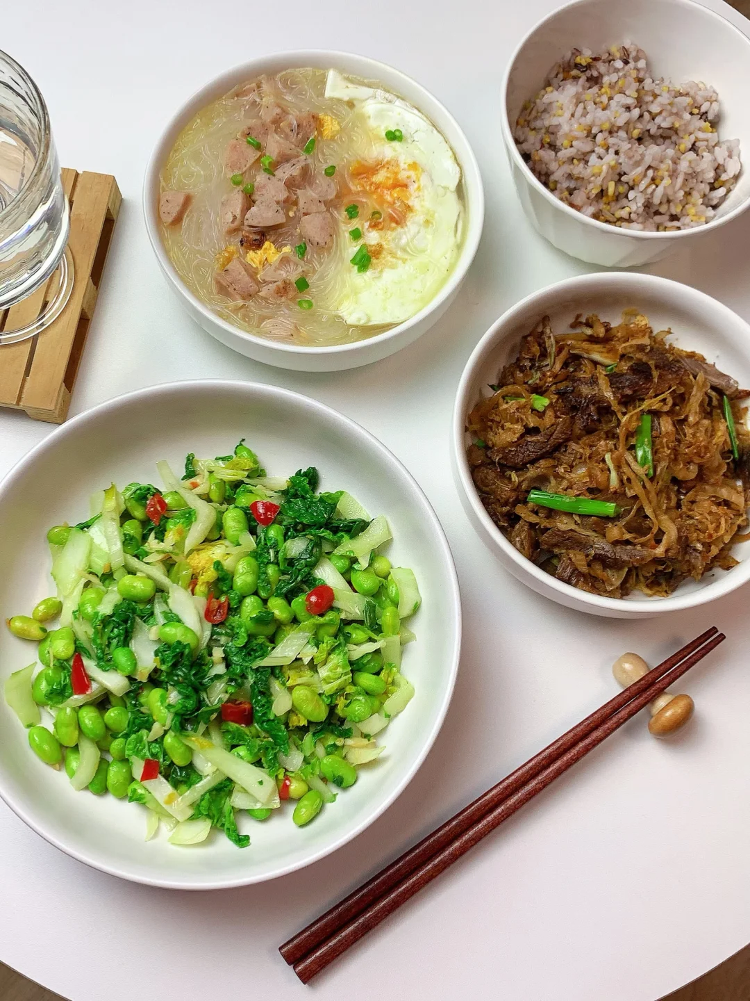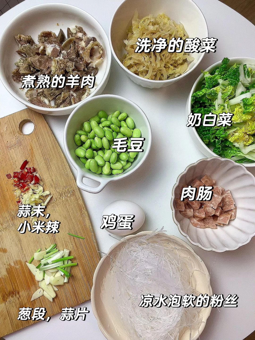 👩🏻🍳分享今日菜单 [一R]酸菜羊肉 [二R]煎蛋粉丝汤 [三R]毛豆炒奶白菜 主食:米饭🍚 ……………………………………………………………………………… 🛒食材清单: 熟羊肉🥩 | 酸菜 | 鸡蛋 | 粉丝 | 肉肠 | 毛豆 | 奶白菜🥬 📝我的美食日记,一日三餐,拒绝外卖[偷笑R],坚持做饭的每一天,吃简单干净的饭菜~ ₍˄·͈༝·͈˄*₎◞ ̑̑ [开箱R]羊肉是自己煮熟后分装冷冻保存的,酸菜是买的袋装的,今天有没有给你提供做饭灵感呀[萌萌哒R][萌萌哒R]