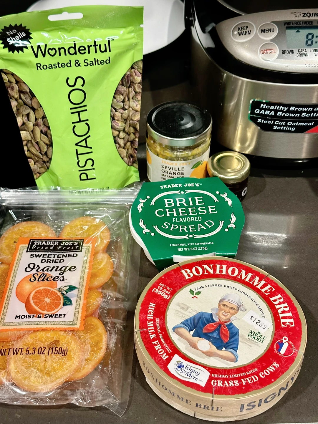 布理奶酪一整块,缺德舅布理奶酪酱,开心果,橙子果酱,蜂蜜,糖渍橙子片。