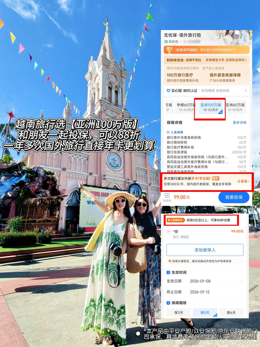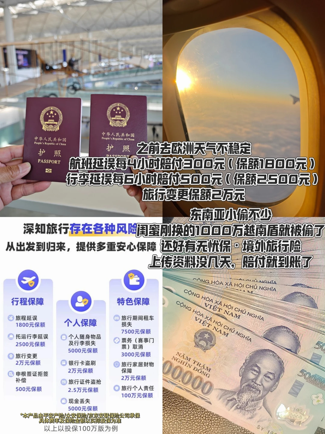 和闺蜜坐邮轮去东南亚玩儿,免不了东想西想—毕竟出门在外,万一碰到航班延误、东西丢失或者突然生病之类的意外,那多扫兴啊,而且在外面人生地不熟的,处理起来也很麻烦,所以这次出发前我就老老实实给自己买好了无忧保·境外旅行险,有了它兜底,岸上游自由行可以安心很多 ✅医疗保障 冬季坐邮轮很担心流感 邮轮上,岸上国外的医疗都巨贵 到下龙湾赶上降温大风开始感冒,去医院看诊和拿药花了500多万越南盾,幸亏无忧保有100万医疗保额,0免赔额,而且1元起赔,在国外看病不用慌!要是自费,小感冒花大几千人民币真的哭si😭 ✅财物保障 东南亚的小偷不少,一定要小心 包包千万不要背在后面 稍不留神,闺蜜刚换的1000万越南盾(人民币3000元左右)就被偷走了 还好无忧保有现金丢失保额5000元 报警提供资料拿到回执就可申请赔付 除此之外,还包含随身物品损失保额5000元、银行卡盗刷保额2万、旅行证件盗抢保额2.5万,东西丢了也有兜底的感觉真的太爽了~ ✅高风险运动保障 像芽庄的黑岛潜水,玩滑翔伞 这些都在保障范围内 不用再额外买其他保险 7*24小时的全球紧急救援,还有中文翻译 户外爱好者有这个保险玩的更安心 ✅行程保障 这次坐游轮出行还好,上次飞欧洲,天气原因晚点4小时,直接赔付了300元,无忧保这点还是不错的。航班延误有1800元保额(每延误4小时赔付300元),还有行李延误,行程变更也都可以赔偿 去国外旅行怕没保障,选择【无忧保·境外旅行险】基本上就都能覆盖。除了东南亚,像法意瑞等申根地区和美国英国澳洲等全球地区都在保障范围内,如果经常出国游,冲年卡会更划算 购买指南: 支付宝搜索【境外旅行险】,选择对应版本投保即可(一定要提前在境内买好‼️按天数选)和朋友一起投保还可以88折,主打一个该花花该省省💰