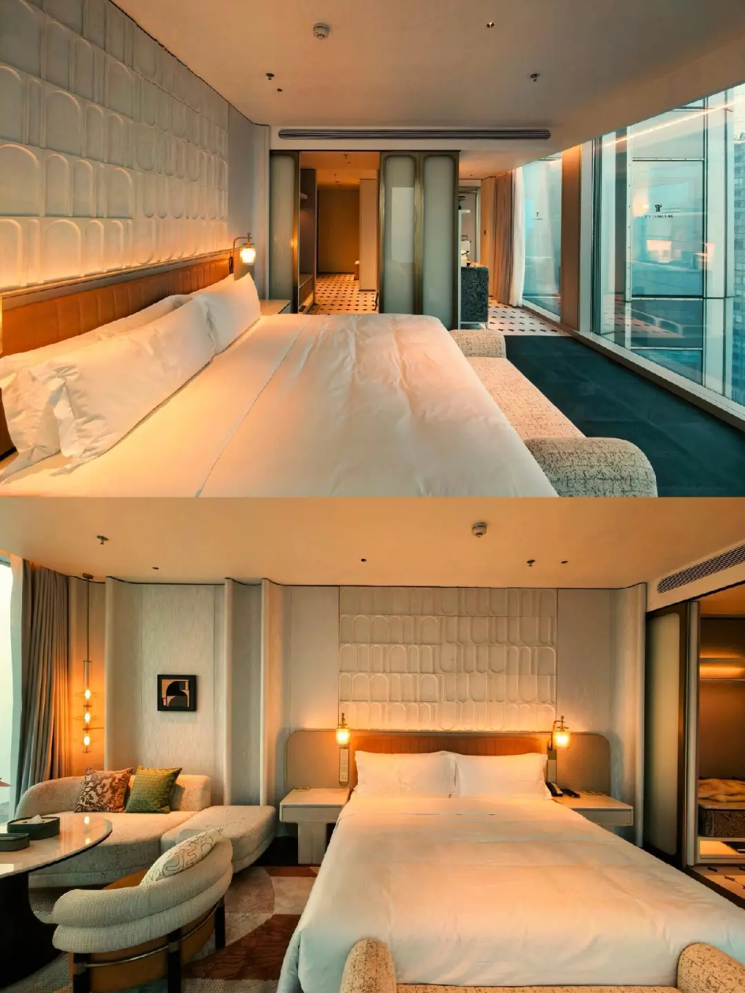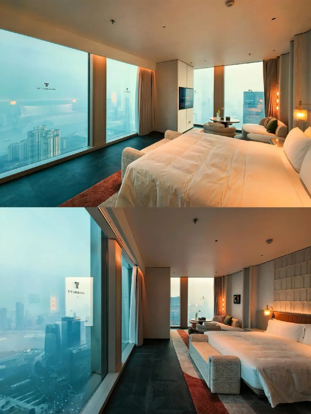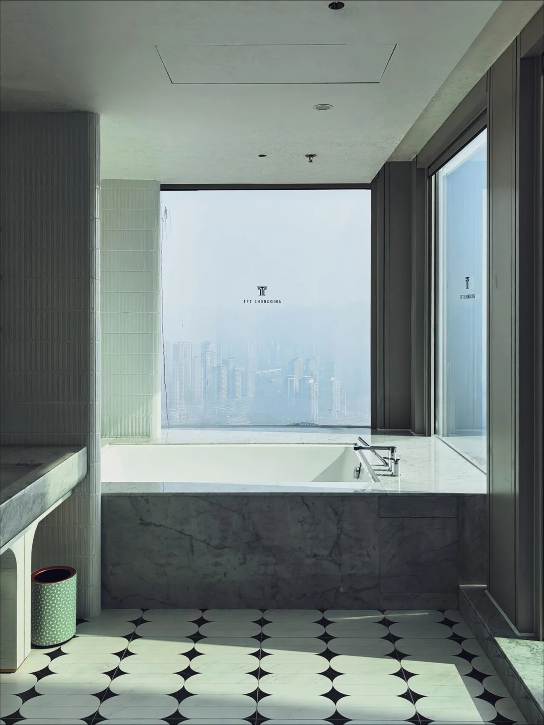 212间客房都是江景房,面积38㎡起跳。本次入住55平开放式江景套房(朝天门景),270度纵览壮丽江景,来福士、洪崖洞、大剧院,解放碑cbd等地标尽收眼底,另外还可以看到正在建设中的W酒店,每周六晚上可以直接在房间里看无人机表演。盲猜这是今后最受欢迎的房型。房间采用唯宝卫浴、智能马桶+戴森吹风机的组合,洗手池为双台盆,备品为悦碧施迷迭香/白茶系列,个人非常喜欢。嵌入式浴缸同样也是夸张的270度江景,泡澡看夜景氛围感拉满。