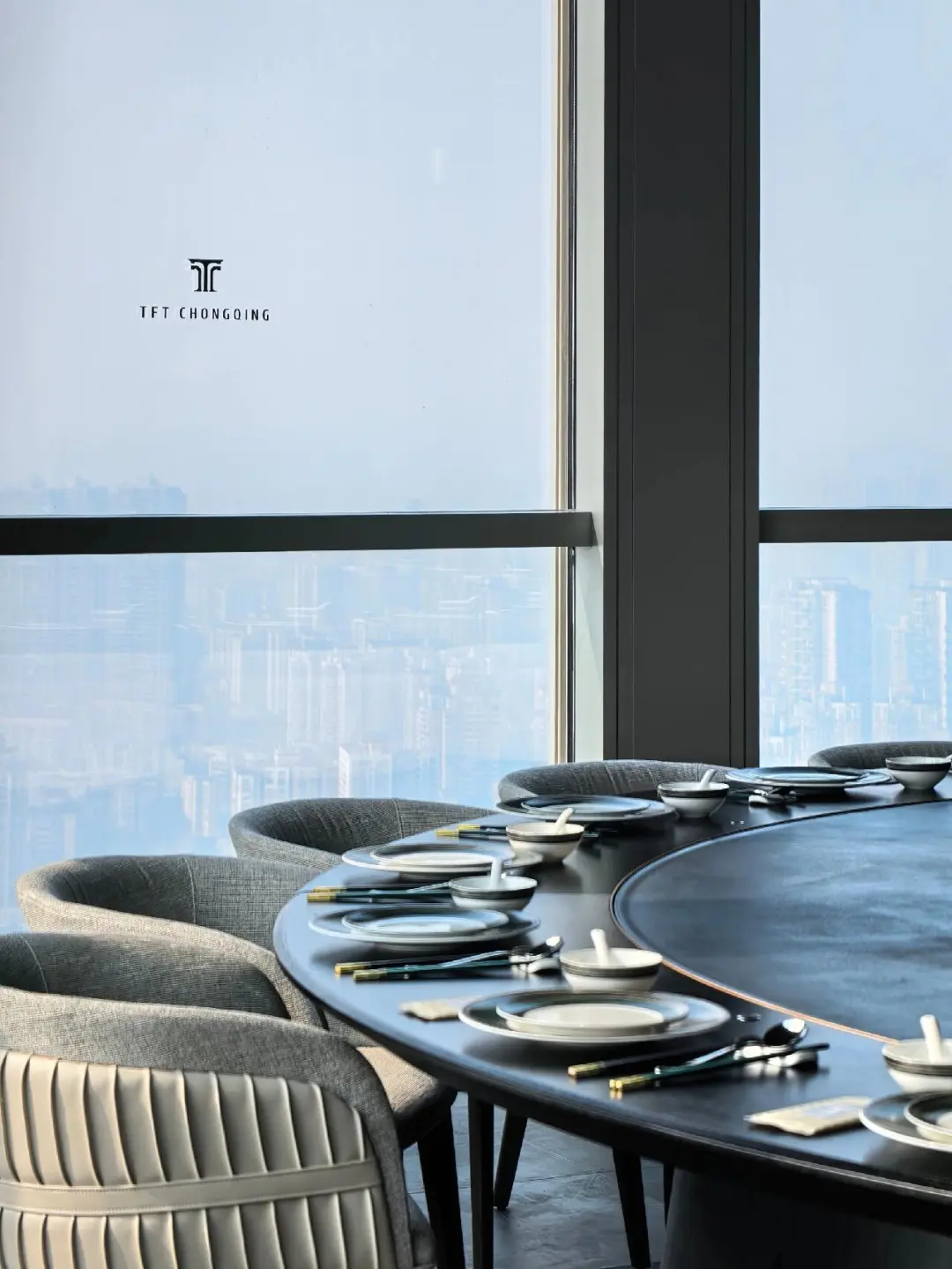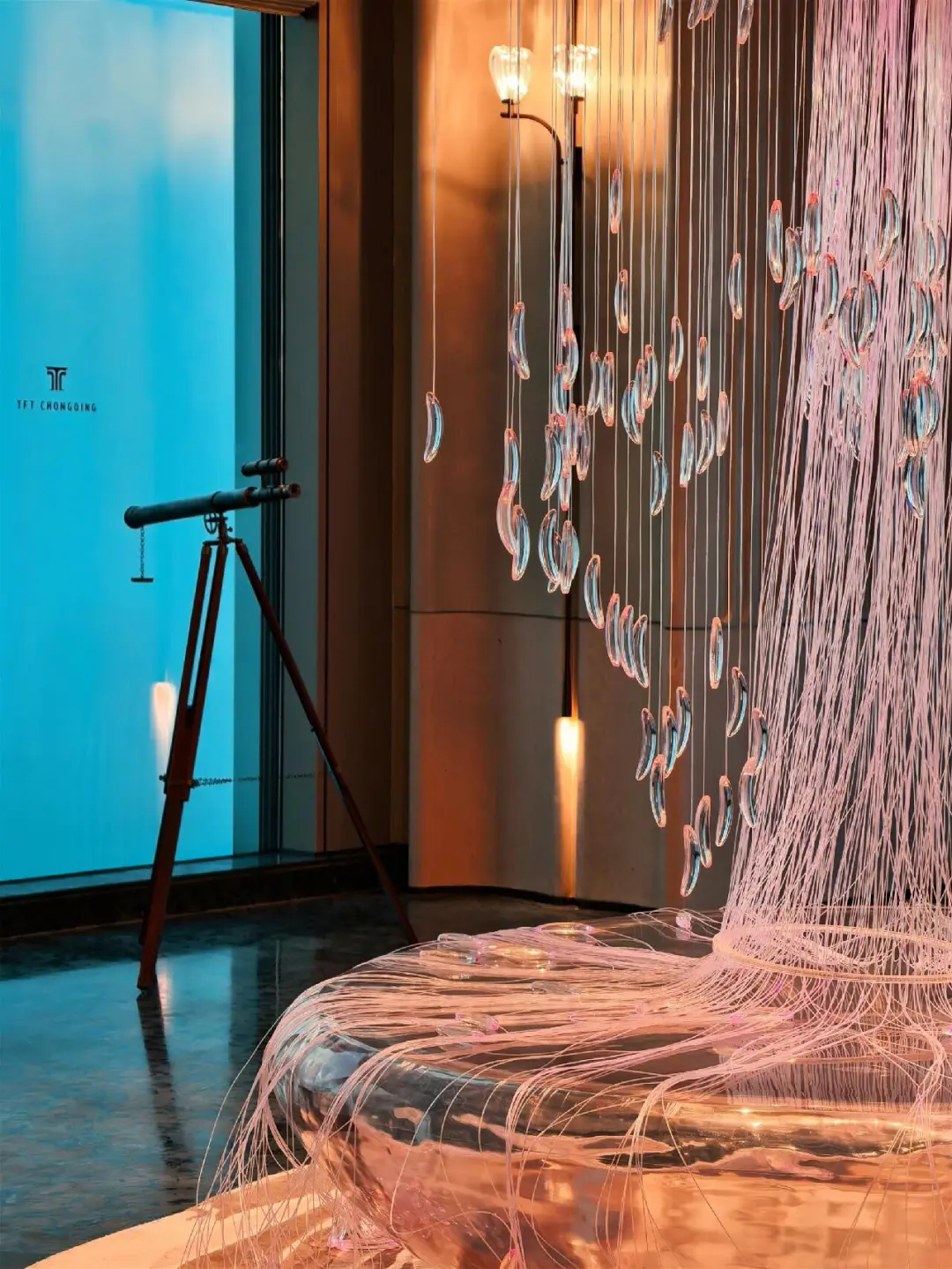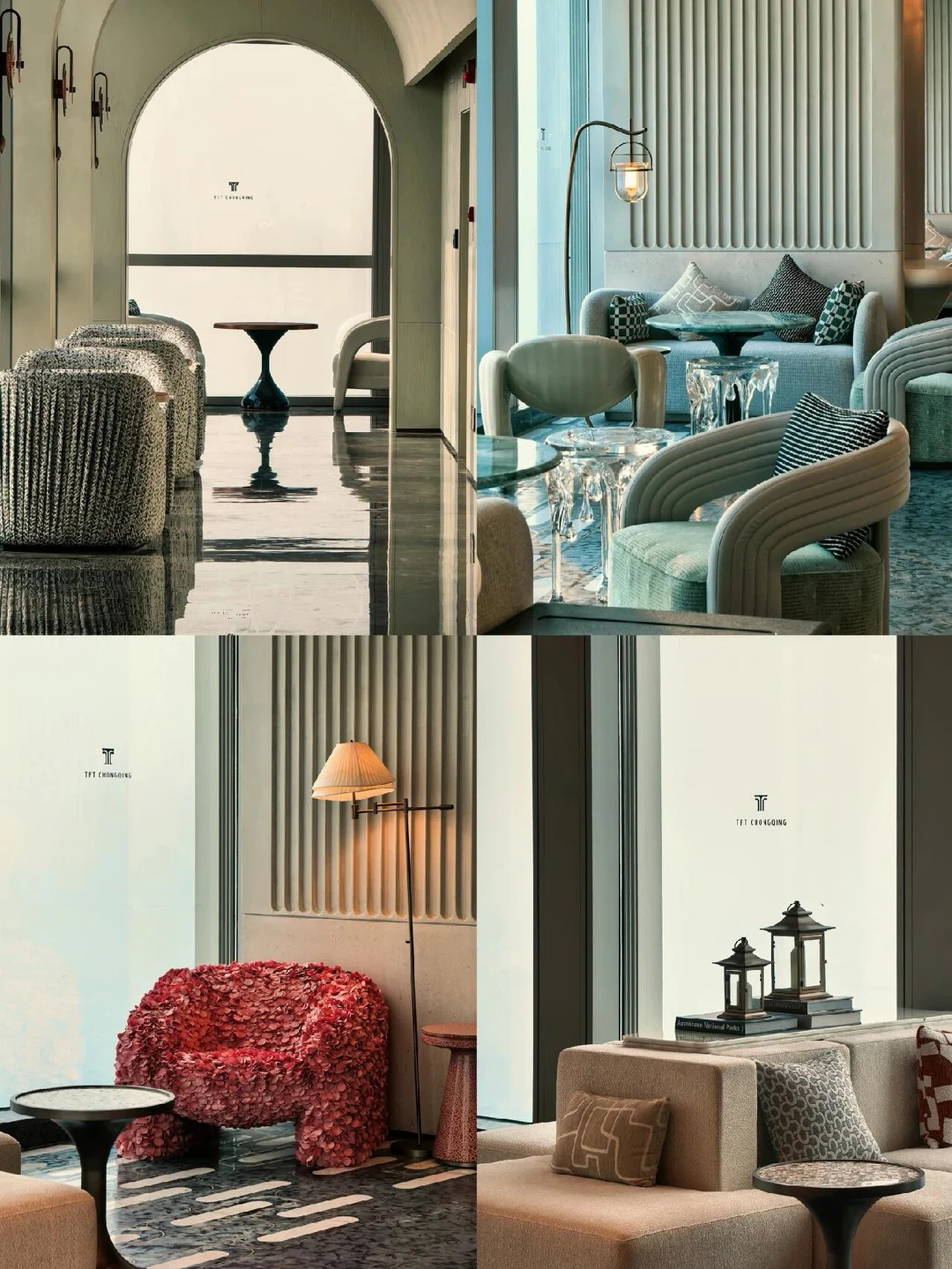 酒店设计由We design担纲,TFT取自“The Frontier Tower”,整个设计也是围绕着重庆“桥都”的主线,桥韵贯穿Art Deco风的云端美学。