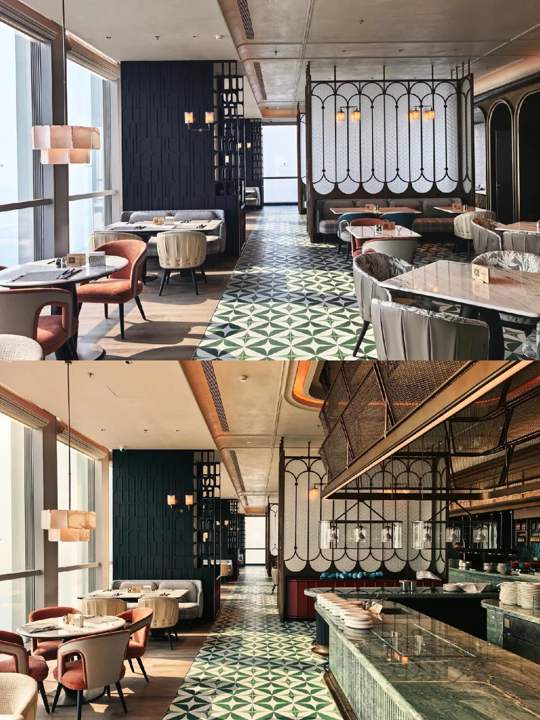 61层的空中大堂挑高空间以桥为灵感,高空连廊酷似星际迷航廊桥,串联了左手边的候客区和右手边的大堂吧。