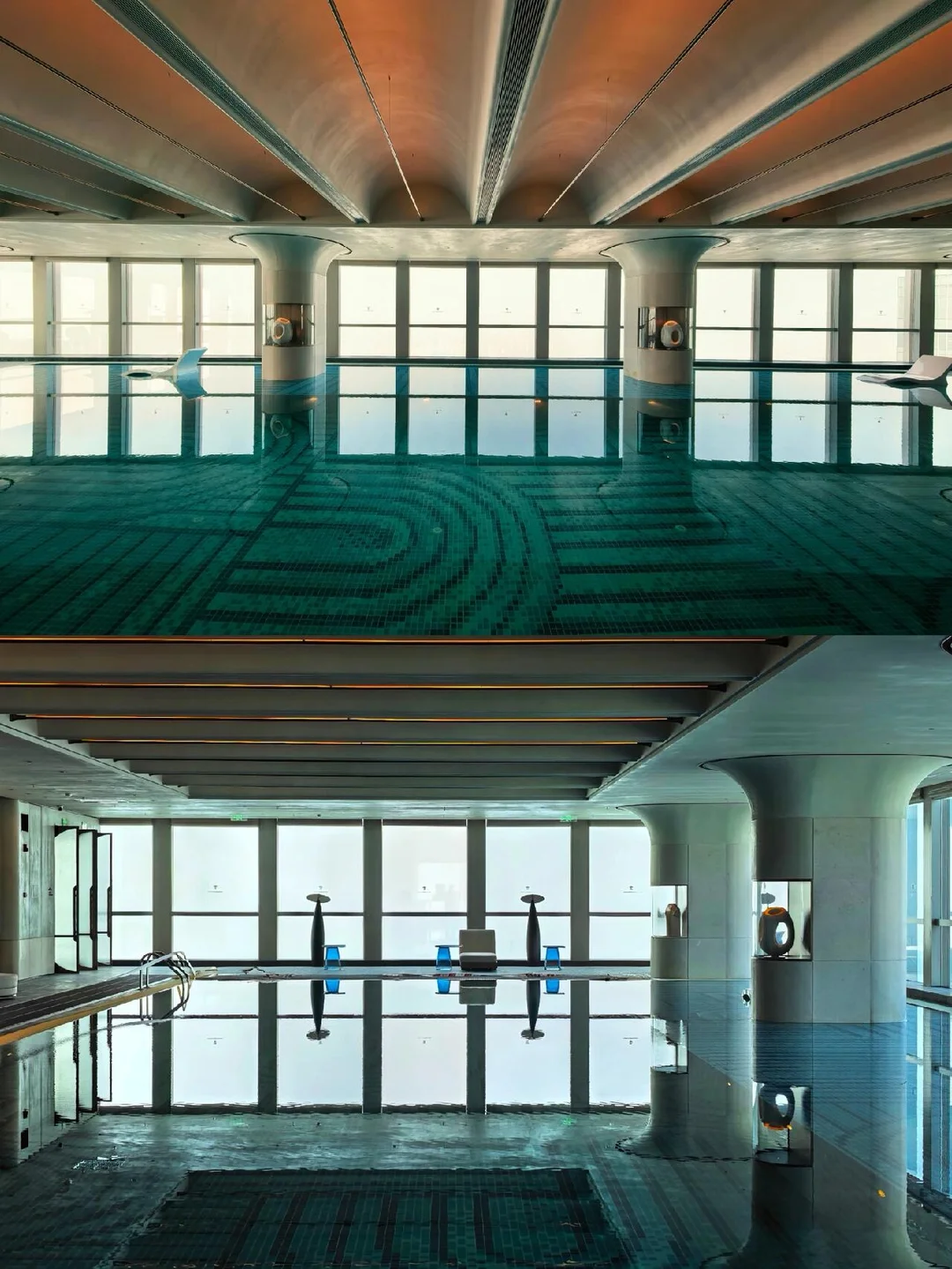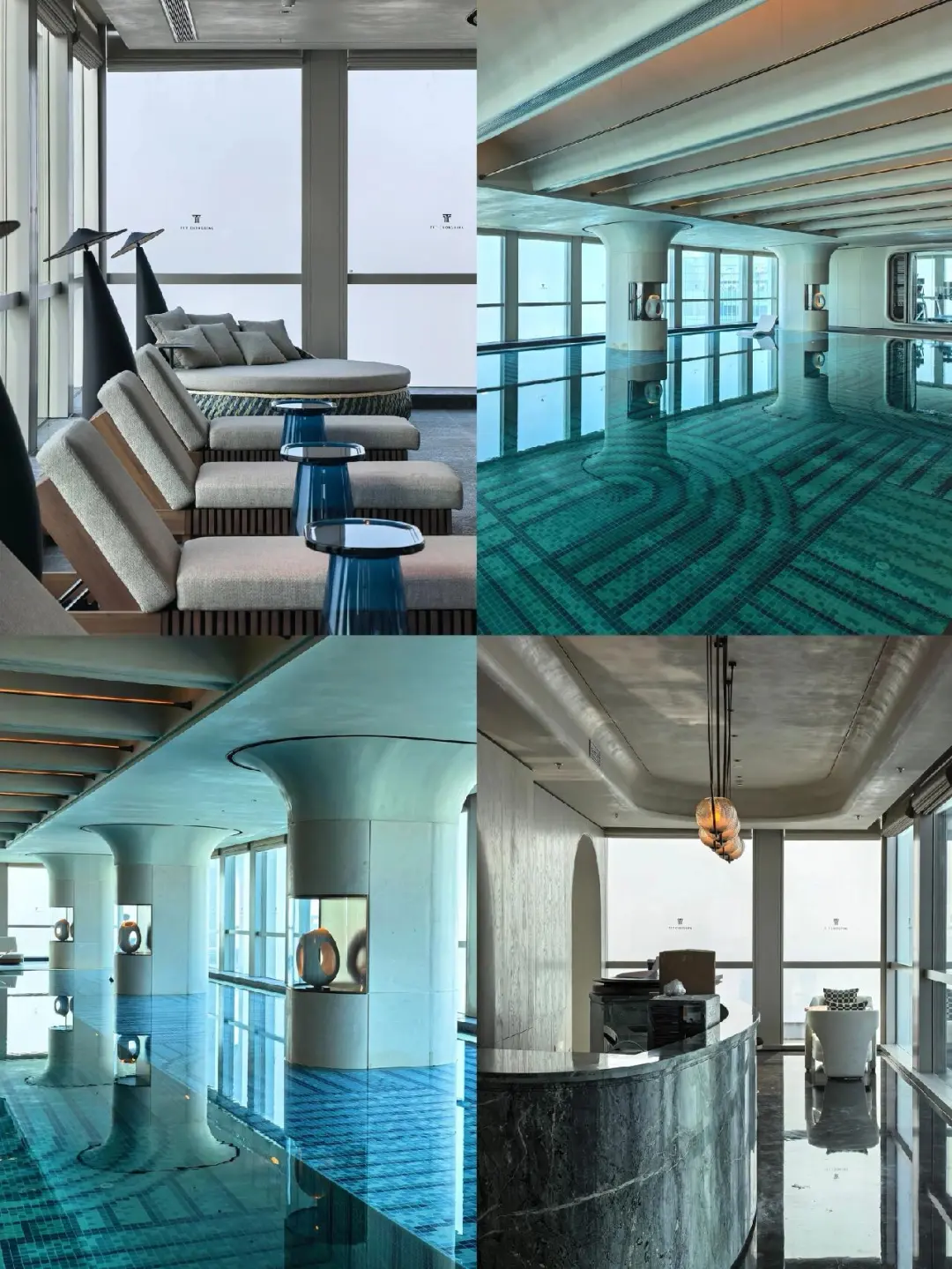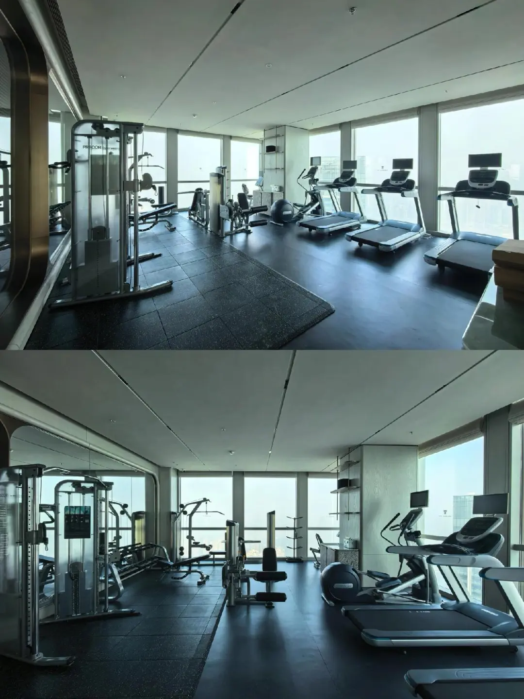 酒店在66层配备了高空泳池和健身房,泳池面积很大,很有意思的是在泳池旁配备了专门的水吧,估计后续酒店会着重向城市度假方向运营。健身房同样也是270度江景。