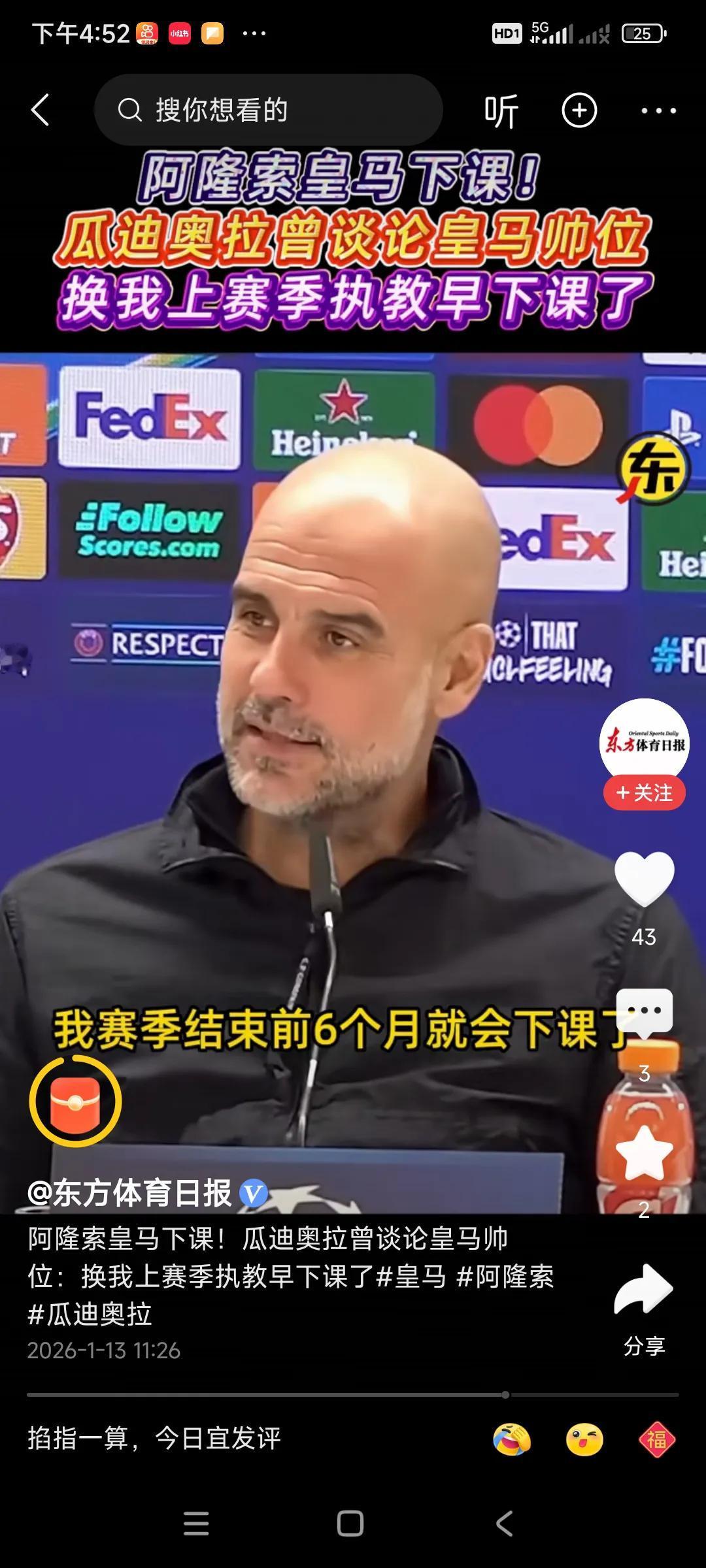 瓜帅谈阿隆索下课,真的的为阿隆索叫屈,, 瓜帅去年执教曼城四大皆空,俱乐部也没有炒他,曼城俱乐部高层太厚道了,相当包容,可以长久干下去,, 他这个成绩要是在皇马,去年也应该下课了,, 皇马主帅肯定是压力最大的工作,稍不留神,就下岗了,,, 所以找工作,不一定找工资最高的公司去面试,要找一个相对稳定的公司,工资也不错的公司,可以长久干下去, 结婚,过日子也一样啊,,,, 如果武大郎的妻子小潘相貌平平,不引人注目,说不定可以平平淡淡过一生了,,[捂脸][捂脸]