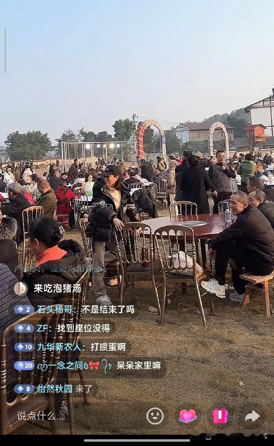 呆呆妹同款刨猪饭来了 周边竟扎堆搞起“同款宴席”! 呆呆妹家的刨猪饭明明都散场了,可重庆乡下这地界儿反倒更热闹了!直播镜头里,邻边人家支起几十张圆桌,大盆装的烧白、土豆烧肉摆满长桌,塑料碗、一次性筷子堆得老高,甚至还有人顶着“呆呆妹表姐”的名头开直播,引来网友当场拆穿“冒充的”。 现场乌泱泱坐满了人,有本地村民,也有没赶上呆呆妹饭局的外地游客,大家凑着热闹吃席,直播间里还飘着“呆呆都上人民日报了,这热度谁不想蹭”的评论。有人觉得这是借着流量搞乡村热闹,也有人说就是纯纯的跟风蹭热度,吃相太难看。 可话说回来,靠着网红的流量办宴席赚人气,到底是乡村流量的聪明玩法,还是没底线的蹭热度?这种跟风式的热闹,真的能长久吗?