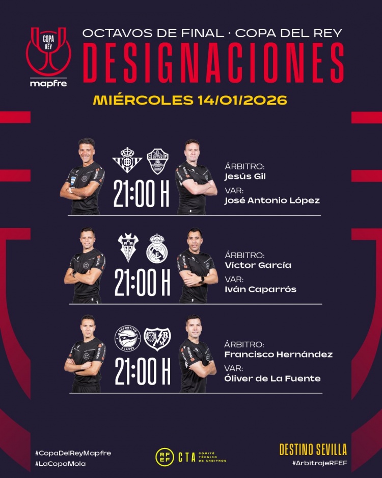 直播吧1月13日讯北京时间周四凌晨,西班牙国王杯将进行三场比赛,西班牙足协官方公布了相关裁判安排,维克托·加西亚执法皇马客战阿尔瓦塞特。