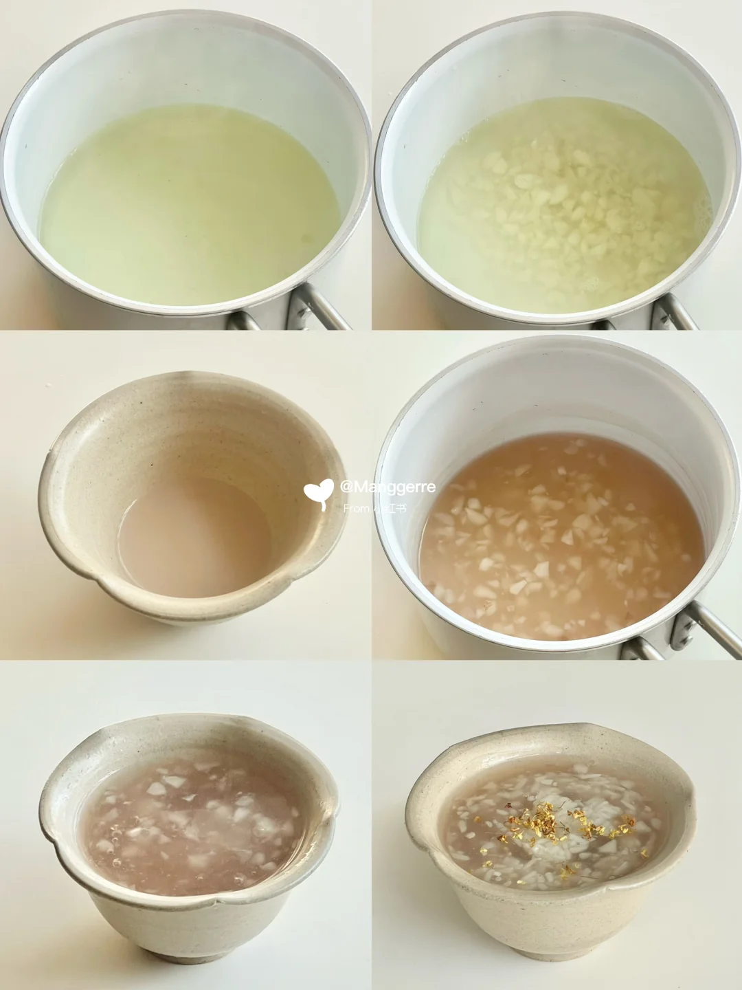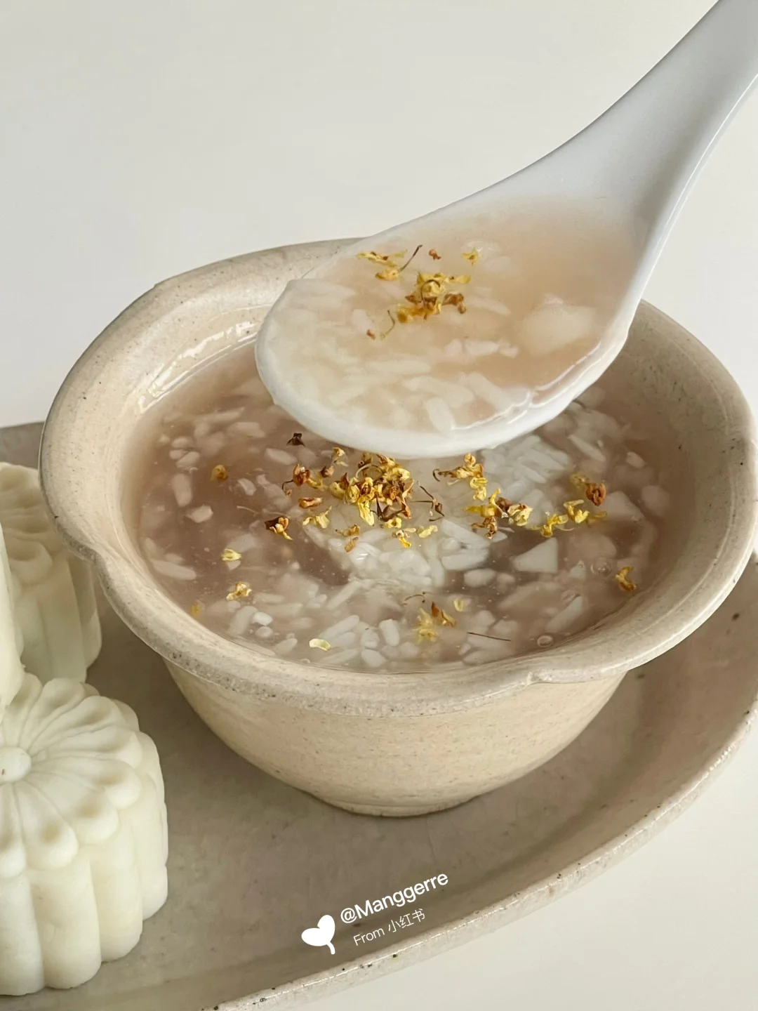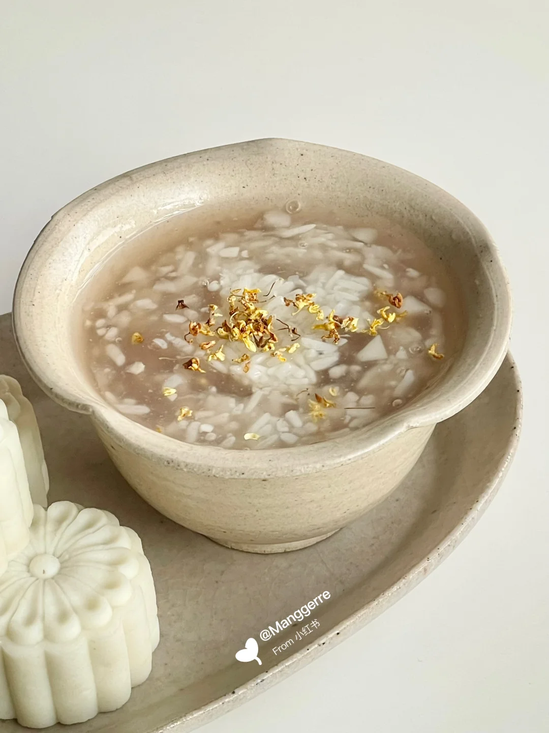 4、甘蔗饮倒入碗中,撒上干桂花装饰即可