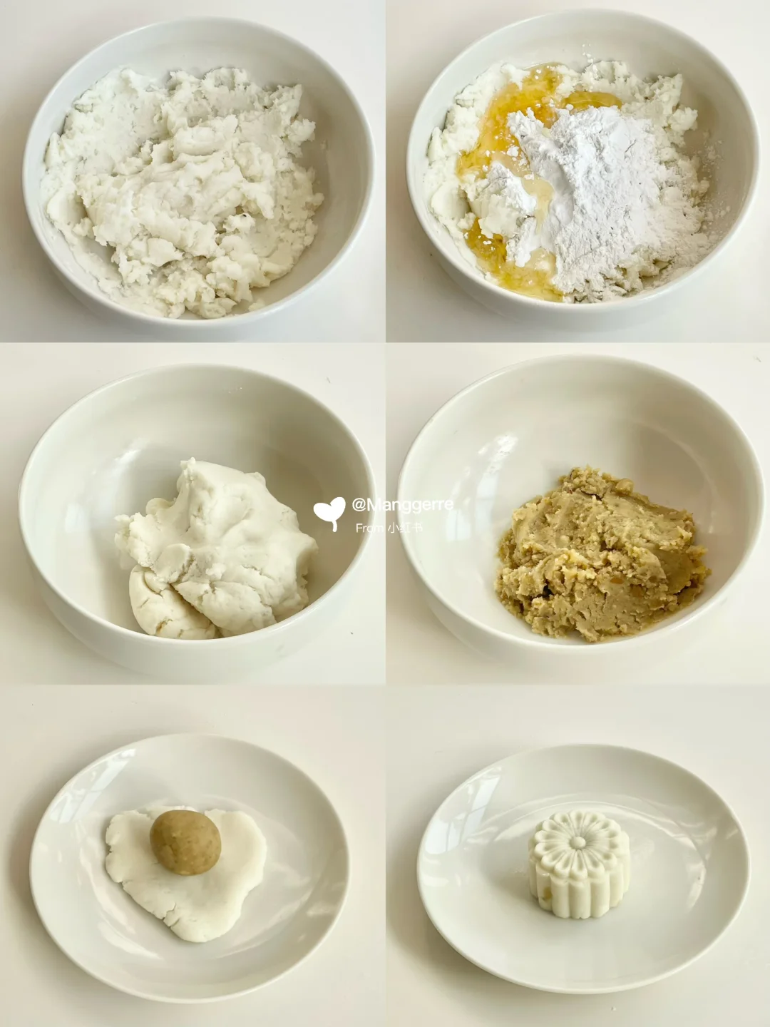 1、山药蒸熟碾压成泥,加入糯米粉、玉米油搅拌均匀揉成面团