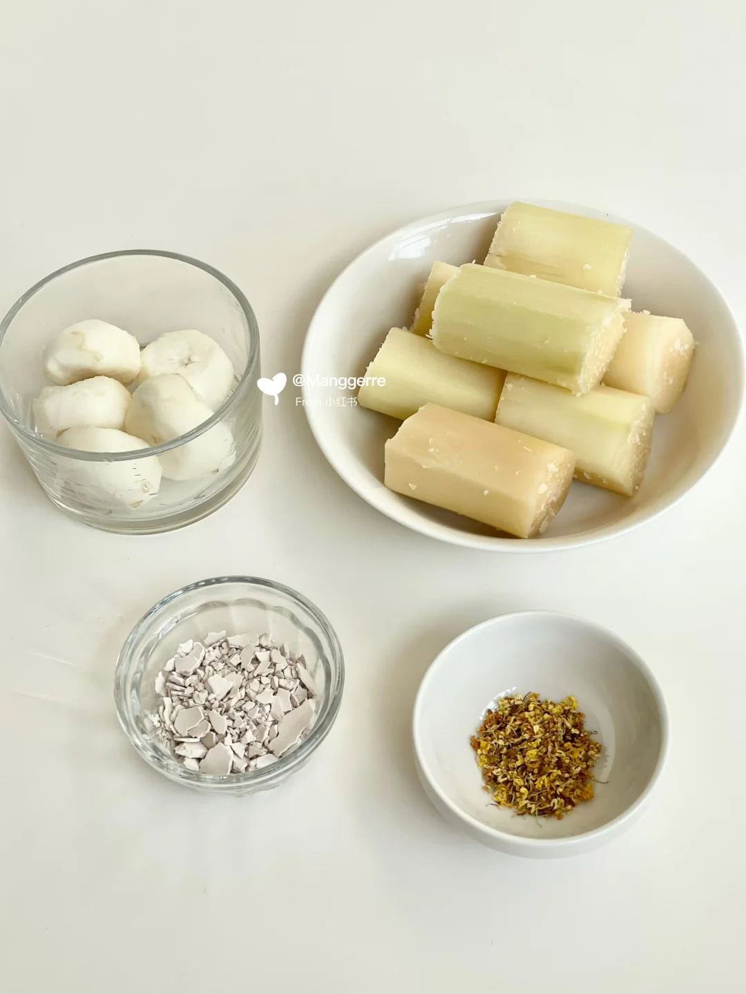去皮马蹄3个、甘蔗200g、藕粉15g、干桂花