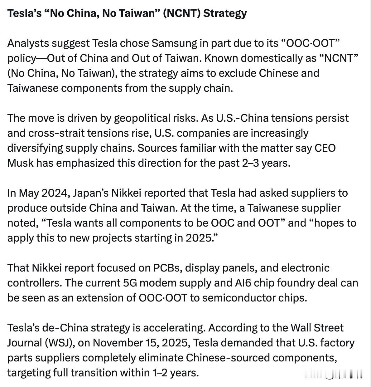 韩国三星将向特斯拉供应5G调制解调器 三星电子正在向美国电动汽车制造商特斯拉供应车用5G调制解调器。这是三星首次向特斯拉提供车用级5G调制解调器。特斯拉此前于去年宣布,已委托三星晶圆代工生产其用于自动驾驶的下一代AI6芯片。如今,特斯拉又从三星采购5G调制解调器,两家公司似乎正在进一步巩固合作关系。 据业内人士13日透露,三星电子系统LSI事业部已完成特斯拉专用车载5G调制解调器的研发,目前正处于测试阶段。预计将于今年上半年开始供货。首批产品将应用于特斯拉在德克萨斯州运营的无人驾驶出租车服务,预计之后将推广至普通乘用车。 三星电子于2024年初开始研发该产品。芯片设计由系统LSI事业部负责,模块组装则由一家合作公司完成。三星已将5G调制解调器商业化应用于智能手机,但汽车版本有着不同的要求:它们必须能够承受极端温度和振动,并保证超过10年的使用寿命。为了满足特斯拉的规格要求,三星开展了一项独立的研发流程。 这项供应协议源于2023年5月三星电子董事长李在镕与特斯拉首席执行官埃隆·马斯克在位于硅谷的三星电子北美半导体研究中心举行的一次会晤。当时,双方广泛讨论了在自动驾驶人工智能芯片和汽车通信组件方面的合作。 此前,特斯拉一直依赖高通的调制解调器。一位业内人士表示:“特斯拉正努力减少对高通的依赖,并围绕美国和韩国重组其供应链。”他还补充道:“5G调制解调器是双方合作的首个切实成果,而这项合作的起因甚至早于人工智能芯片的研发。” 2025年7月28日,三星电子和特斯拉宣布签署一份价值22.7648万亿韩元的AI6芯片代工合同。一旦5G调制解调器供应量增加,双方的合作将涵盖人工智能芯片和通信芯片。 这项交易对三星系统LSI事业部也意义重大。它为三星提供了一个机会,使其能够将此前主要面向智能手机的调制解调器业务拓展到汽车领域。特斯拉凭借其全自动驾驶(FSD)技术引领市场,业内普遍认为,没有其他汽车制造商在这一领域真正超越特斯拉。如果三星能够成功与特斯拉建立合作关系,则可能会吸引其他汽车制造商的关注。 FSD(完全自动驾驶)的驾驶决策由车载计算系统处理,但稳定的网络连接对于地图、车队管理、远程诊断和OTA(空中下载)更新至关重要。正是在此背景下,特斯拉决定重组其5G调制解调器供应链,为扩展其自动驾驶出租车服务做准备。 特斯拉的“不进中国,不进台湾”(NCNT)战略 分析人士认为,特斯拉选择三星的部分原因是其“OOC·OOT”(除中国大陆和台湾)政策。该政策在国内被称为“NCNT”(除中国大陆,除台湾),旨在将中国大陆和台湾的零部件排除在供应链之外。 此举受地缘政治风险驱动。随着美中关系持续紧张以及两岸关系日益紧张,美国企业正不断推进供应链多元化。知情人士透露,首席执行官马斯克在过去两三年里一直强调这一方向。 2024年5月,日本《日经新闻》报道称,特斯拉已要求供应商在中国大陆和台湾以外的地区生产。当时,一位台湾供应商指出,“特斯拉希望所有零部件都采用非中国大陆和台湾地区生产方式”,并“希望从2025年开始将此应用于新项目”。 日经新闻的那篇报道主要关注印刷电路板、显示面板和电子控制器。目前的5G调制解调器供应和AI6芯片代工协议可以看作是OOC·OOT模式向半导体芯片领域的延伸。 特斯拉的去中国化战略正在加速推进。据《华尔街日报》报道,特斯拉于2025年11月15日要求其美国工厂零部件供应商彻底停止使用中国产零部件,目标是在1-2年内完成全面转型。 特斯拉否认了该报道。特斯拉中国区副总裁陶喆于11月26日在微博上发文称,“原产国或地理位置并非排除标准”,并表示“美国、中国和欧洲采用相同的标准”。然而,无论官方立场如何,业内人士普遍认为OOC·OOT(原产国/地理位置)政策已经生效。三星5G调制解调器的供应和AI6代工订单被视为这一更广泛转变的一部分。 如果 OOC·OOT 模式蔓延至其他美国汽车制造商,韩国企业或将从中受益。若排除中国大陆和台湾地区,则可供选择的替代方案仅限于韩国、日本和东南亚,而拥有先进半导体技术的韩国本土企业通常被认为是主要受益者。