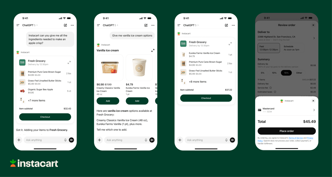 这意味着,全新的买家服务商(BuyerAgent)可能会崛起,12月8日,Instacart成为第一个在ChatGPT内推出完整购物功能的公司,它由“卖家中心”转变为“买家中心”,以全网比价为例,买家发起一句话的描述,AI可以在用户购物前自动扫描所有电商平台该商品及其SKU的价格,找到最优价,此时,过去流量、促销、推荐等玩法都将被新方式所取代。与此同时,电商卖家也会借助AI寻找更具性价比的货源、提升供应链效率,在买家代理的筛选机制下,那些“大数据杀熟”卖家甚至可能连进入推荐列表的机会都没有。