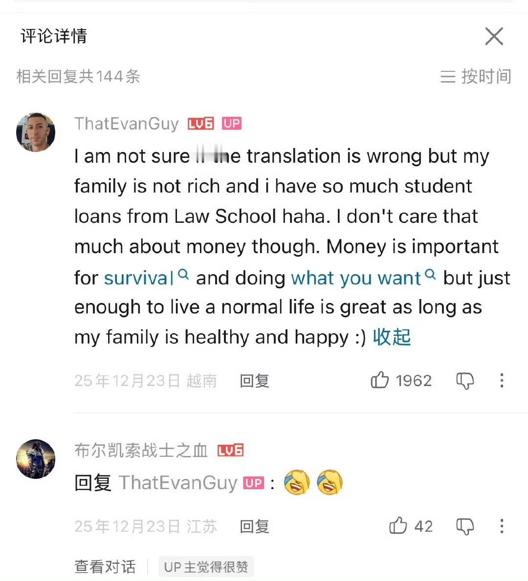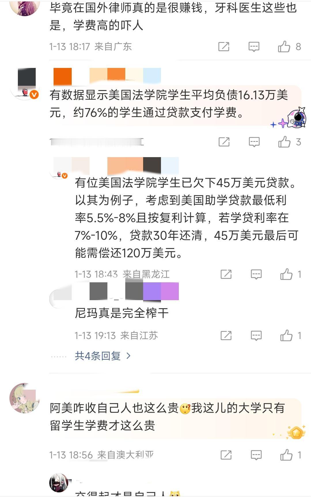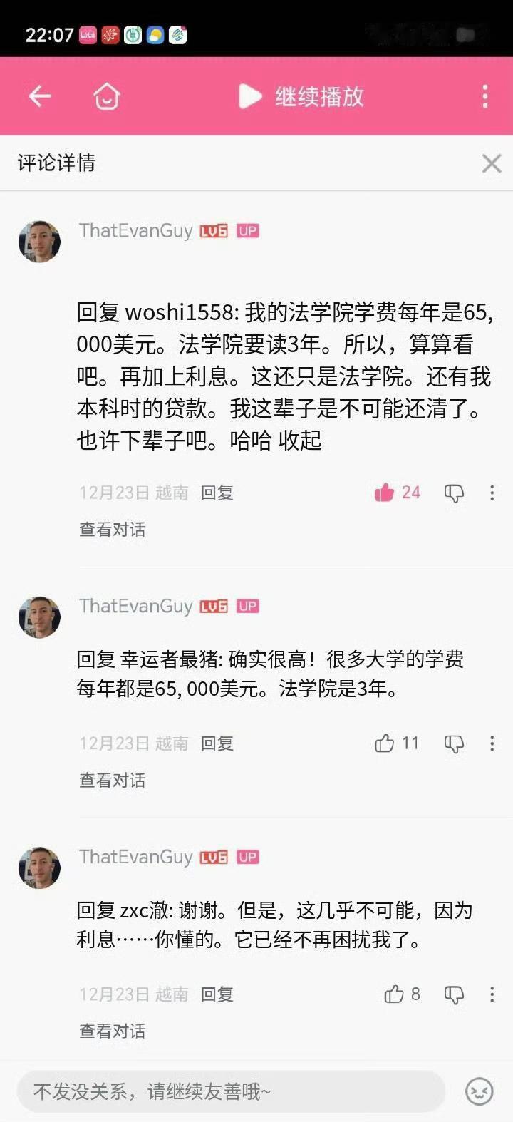 美国视频博主碳水哥称这辈子都还不完学贷了。他说他已经想开了,这事已不再困扰他了。 他在法学院的学费是每年65000美元,3年,就是195000美元。在美国读法学院需要本科以上学历。所以,他必须再加上他本科4年的学贷,再利滚利,总还款额肯定超一百万美元。 碳水哥好像读的还是芝加哥大学的法学院毕业的。 万斯在他的《乡下人的悲歌》里面说过他去耶鲁法学院然后欠下20万美元。 埃文凯尔也说他的贷款不准备还(大概意思),在食贫道re美国那期说的。 美国学贷真的是猛于虎啊! 美剧里有过女法学院学生去当伴游女郎。 难怪碳水哥在中国游玩时特别开心,食物便宜还能狠狠吃饱。他餐馆去不起,全在街边摊吃小吃,有一种短生种的豁达。好多人让他去餐厅尝尝。 他现在靠做视频求生。
