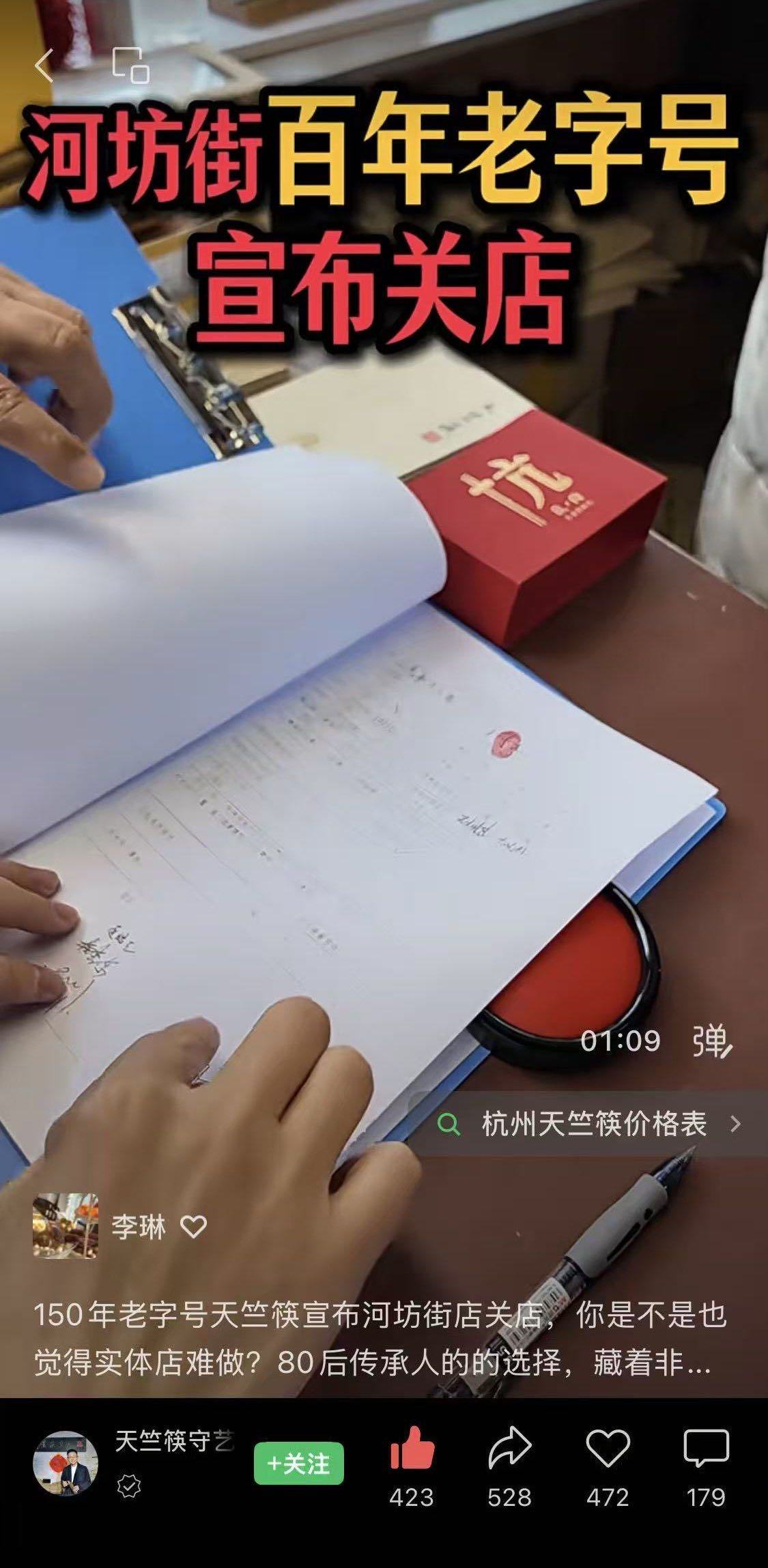 近日,一段杭州老字号天竺筷河坊街门店闭店的视频,引发广泛关注。