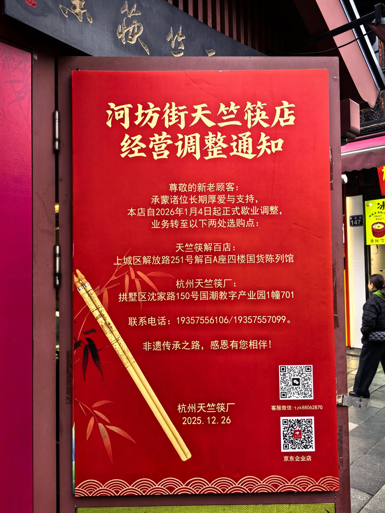 在游人如织的河坊街,一家店铺的悄然关闭,看上去了无痕迹,游客依然打卡、购物、品尝小吃,但少有人注意到,那个曾展示天竺筷的店铺已经换了风景。