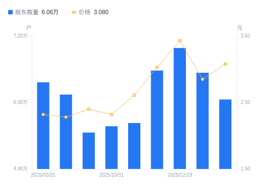 日期A股户数(户)流通A股户均持股数(股)户均持股市值(万元)2026-01-096056132624.5610.052025-12-316537730221.278.612025-12-196987128277.499.702025-11-286577930036.589.102025-11-205629835094.969.162025-10-315573135452.018.222025-09-305458036199.648.692025-06-306142732164.627.332025-03-316365931037.117.202024-12-316880628715.407.44