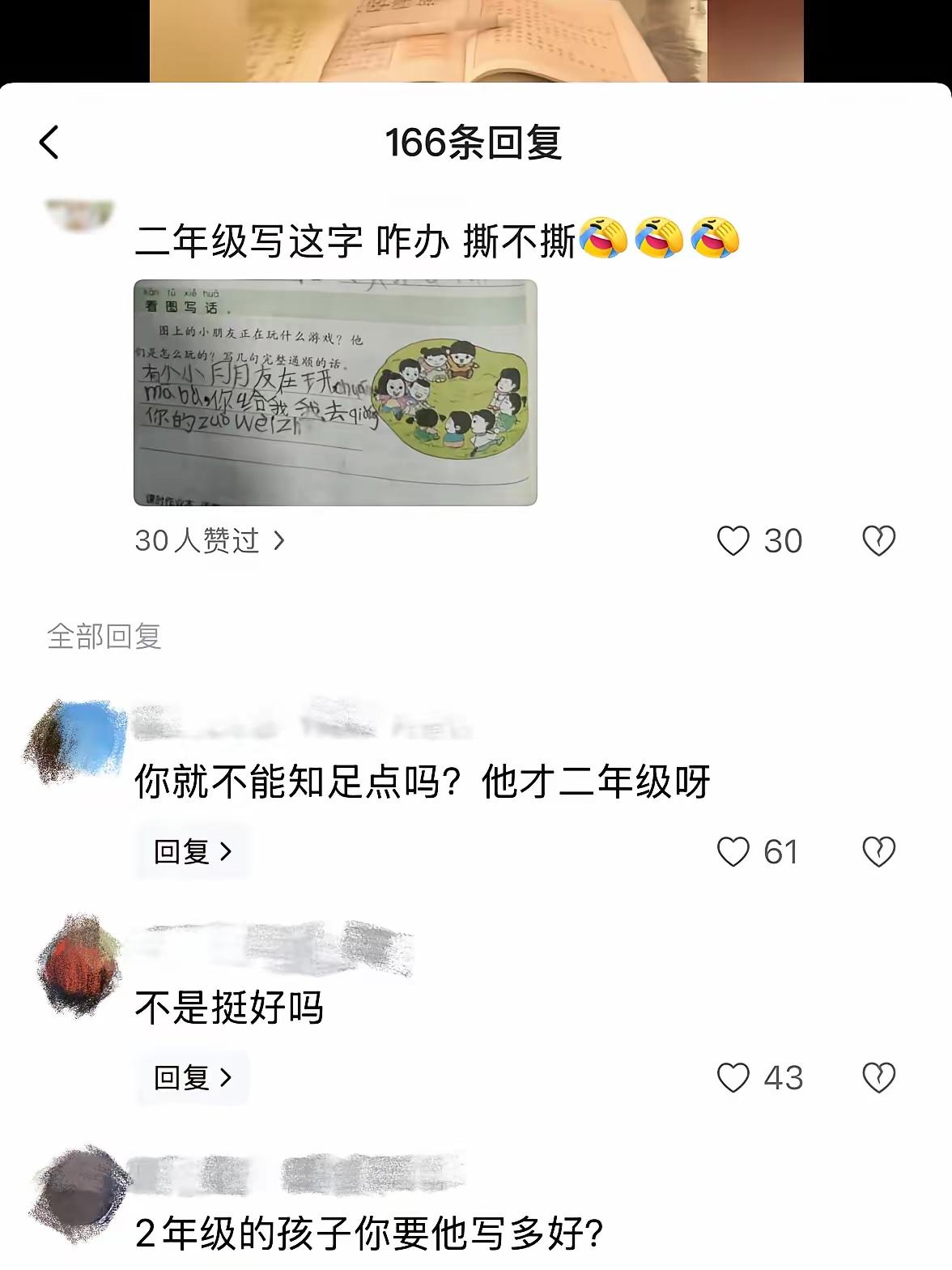 谁看了不揪心?男孩攥着衣角站在原地嚎啕,桌上是被撕得粉碎的作业纸,碎渣子散得满地都是。 那是他抄了好几遍的功课,老师隔天就要检查,如今全成了废纸。 妈妈就站在一旁,脸上没半分软意,只重复着早说过的话,字写得潦草就得撕,重写。 她大抵是觉得,狠一点才能让孩子长记性,却没看见孩子哭到发抖的肩膀。 旁人看了都要叹一声,这般辛苦写下的东西,平白被撕得干净,换谁能忍? 可妈妈眼里只盯着那不算工整的字迹,全然忘了孩子伏案抄写的时光。 有网友一语道破,有没有这样一种可能,孩子已经拼尽全力,眼下就只能写到这般地步。 这话戳中了太多人的心,评论区瞬间就热闹起来。 一位家长晒出二年级娃的作业,字迹清楚,不会的字还细心标了拼音,转头问大家该不该撕。 底下清一色的劝,这般模样于二年级孩子而言,已是用心,何至于苛责。 教育里最忌讳的,便是没个分寸的攀比,被旁人的优秀乱了心神,徒增焦虑。 练字从不是一朝一夕的事,哪能靠一次撕本子,就盼着孩子突飞猛进。 真要想让字变好,描字帖慢慢来也好,找方法引导也罢,总得有耐心才是。 不分青红皂白撕了作业,伤的是孩子的心,留下的恐惧或许多年都难消散。 不少人在底下留言,儿时被撕作业的滋味,到如今想起来仍觉难受。 每个孩子都有自己的节奏,因材施教多些鼓励,远比冷冰冰的苛责管用得多。