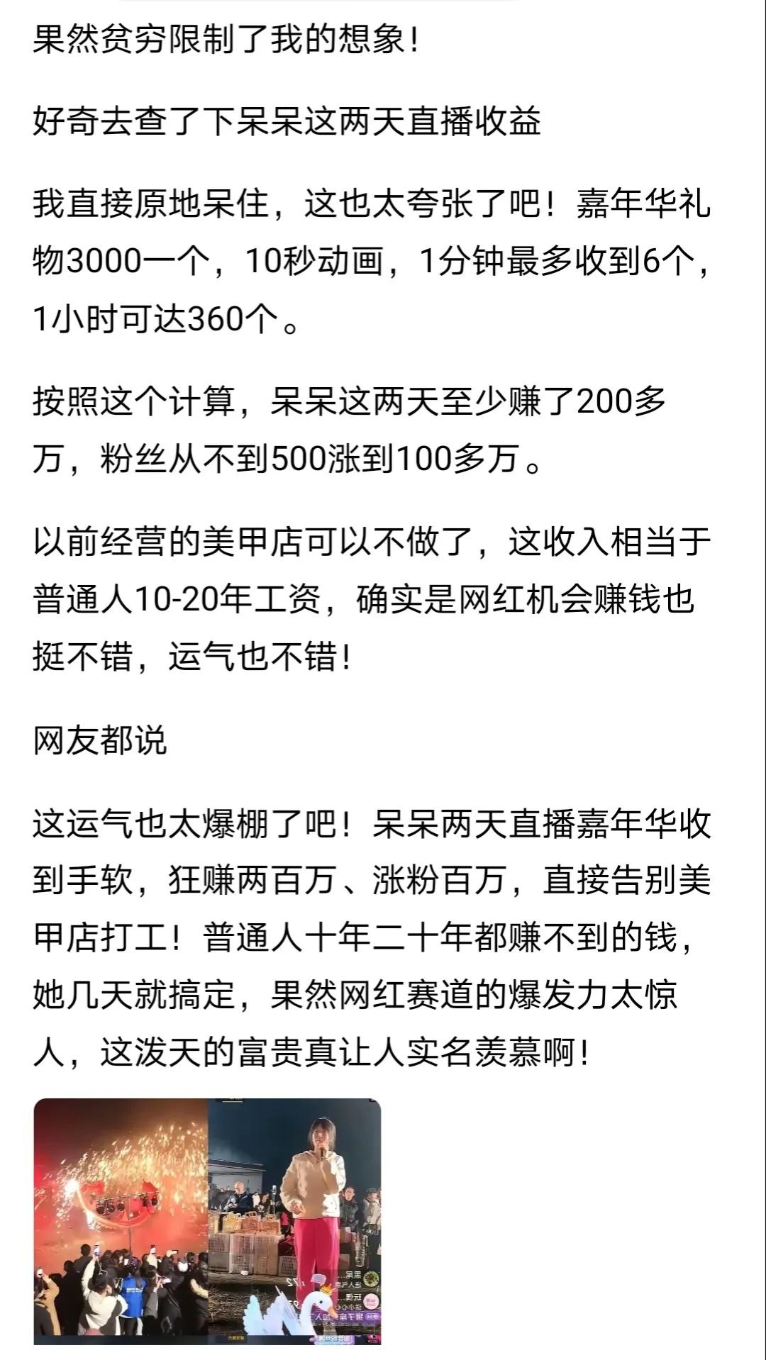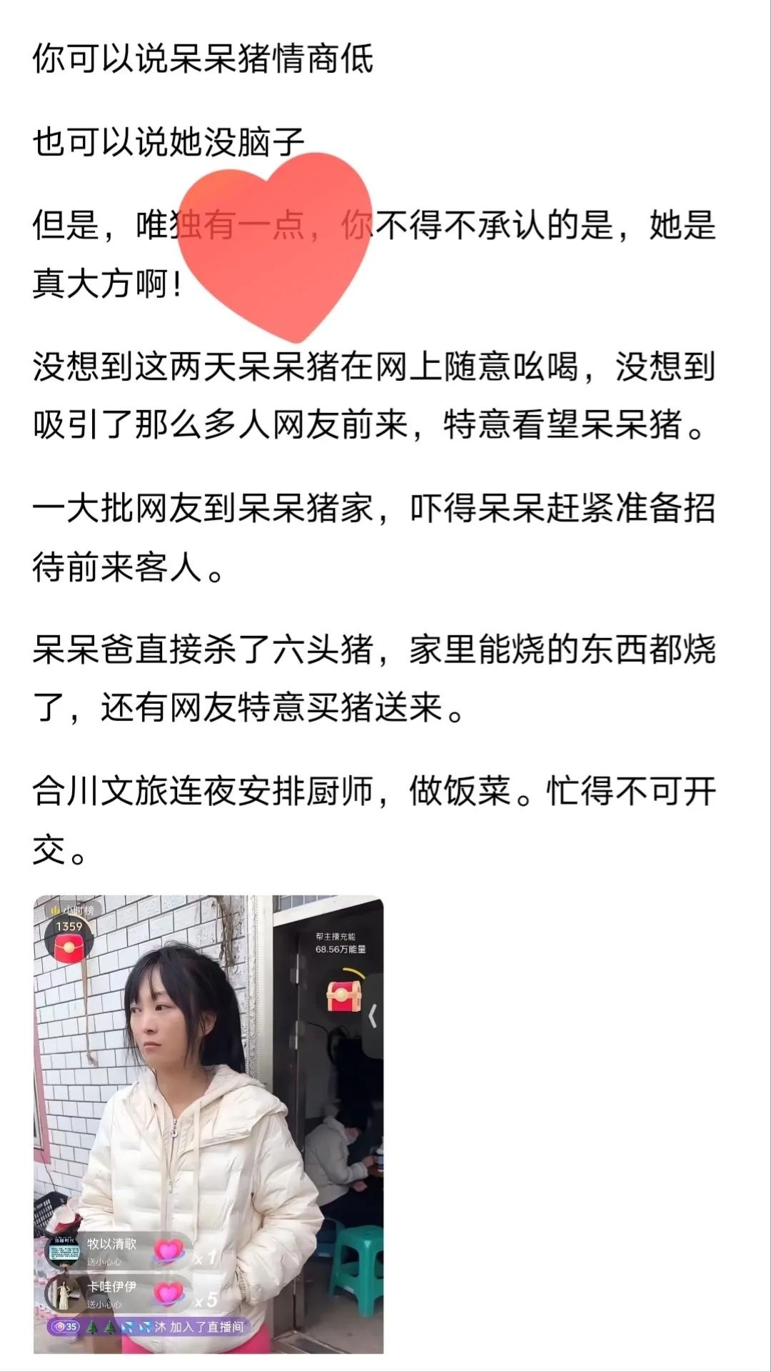 透过现象看本质 ——呆呆事件现象级传播的甜与痛 文/科学真奇妙 2026年1月10日,四川省合川县一个网名叫呆呆的姑娘,声称“1月11号我家要杀两头猪,有人来帮我按猪的,请你吃泡汤饭!年迈的老父亲年龄大了,我怕他按不过猪。另外,就想在家门口停满车,最好是比结婚场面还多的车,在村里让我扬眉吐气一回!”下面还留了地址、群聊二维码以及调侃式的真诚话语,结果真的就把数万网友给吆喝到场了。网友们戏称“呆呆主播”两天挣了几百万,挣了别人几辈子的钱。 “呆呆事件”引发全网现象级传播过程,归结提炼出五个核心观点: 一、核心驱动力的三角结构:情感、文化心理与现实土壤三者的强力共振。 1. 情感内核(甜):共情与治愈。 孝心的当代演绎:“怕老父亲按不过猪”这句话,精准击中了现代人对于父母老去、乡土亲情疏离的普遍焦虑。它提供了一种低成本、高共鸣的情感宣泄和替代性满足——通过帮助“呆呆”,仿佛也在慰藉自己对家乡父母的亏欠。 “真诚”作为稀缺资源:在一个人设泛滥、剧本横行的网络环境里,直接留地址、发二维码、用方言调侃,这种“粗糙的真实感”构成了极强的信任冲击。它满足了网友对“未经修饰的真实生活”的渴望。 2. 文化心理脚本(痛与梦):面子、乡土与集体记忆。 “扬眉吐气”的深层密码:这不仅仅是虚荣,更是无数从乡土走入城镇、在现实中可能并不“阔绰”的个体,对 “衣锦还乡”传统叙事的一次集体代偿。网友们的车,成了她(也是他们自己)在乡土熟人社会中获得认可与尊严的符号。这是对现实社会评价体系的一次温柔反抗。 民俗作为精神家园:“杀年猪吃泡汤饭”不仅仅是一种怀旧,更是对农耕文明集体记忆的招魂。在高速城镇化、年味淡薄的今天,它成了一个极具仪式感的情感入口,让参与者短暂地“回到”了一个更温暖、更有人情味的时空。 3. 现实基础(土壤):充裕的社会能量与流量逻辑。 “闲”与“无聊”背后的本质是“生活水平提高,闲人太多”。这背后是社会生产力的提升与个人闲暇时间的增加,以及由此产生的巨大、待释放的社交参与能量。网络提供了将这种能量瞬间汇聚的渠道。 “黑天鹅逆袭”的全民剧本:在阶层固化焦虑弥漫的当下,“两天赚了几辈子钱”的传说,完美契合了“素人一夜爆红”的现代神话。人们围观和参与,既是在见证奇迹,也是在为自身无法实现的“逆袭梦”寻找一个寄托。 二、现象的“甜”与“痛”:一体两面的硬币。 甜(正面价值):情感的正向流动:展现了陌生人之间基于善意的大规模协作可能,形成了一次温暖的社会实验。 草根话语权的彰显:证明了在流量为王时代,一个普通人凭借真实与共情,也能短暂地占据舞台中心。 文化自信的微观体现:乡土民俗展现出强大的情感凝聚力和时代生命力。 痛点(隐忧与反思): 流量的残酷性与不可复制:这极可能是昙花一现的“彩票效应”。后续如何维系?流量退潮后,“呆呆”和当地生活将面临何种影响?这揭示了流量经济的泡沫性与对人的异化。 仪式感的消解与娱乐化:庄严的乡土仪式(杀年猪、待客)被置入全球直播的娱乐场景,其原本的文化内涵可能被消费和曲解。 线下混乱的风险:未经组织的大规模人群自发聚集,潜藏着安全、交通、卫生等诸多社会管理风险,是对基层治理能力的意外考验。 “成功”定义的窄化:事件最终被热议为“两天赚几百万”,恰恰反映了当下社会对于“成功”的价值判断仍单一地聚焦于物质财富的快速积累,这本身是一种悲哀。 三、本质总结:一场数字时代的“情感共谋”。 “呆呆现象”的本质,是数以万计的个体,在数字技术的赋能下,共同参与演出的一场大型社会心理剧。 剧本:是深植于人心的孝道、乡土情结与逆袭梦想。 舞台:是短视频平台打造的虚拟广场。 演员:主播、网友、围观者皆入戏,各取所需。 票房(礼物打赏):是观众为这场“真实戏剧”自愿支付的“门票”,购买一次情感体验和自我投射的满足。 它甜美,因为它证明了人性中温暖、念旧、互助的光辉依然具有原子弹般的聚变能量。 它刺痛,因为它赤裸地展现了当代人在现实中的情感匮乏、身份焦虑以及对“速成神话”的集体沉迷,同时也暴露了流量经济下个体命运的不可控与乡土文化在现代化冲击下的尴尬转型。 最终,这场狂欢会散去,但它留下的余波——关于真实与表演、流量与价值、传统与现代、个人梦想与集体情绪的思考——将会持续回荡。