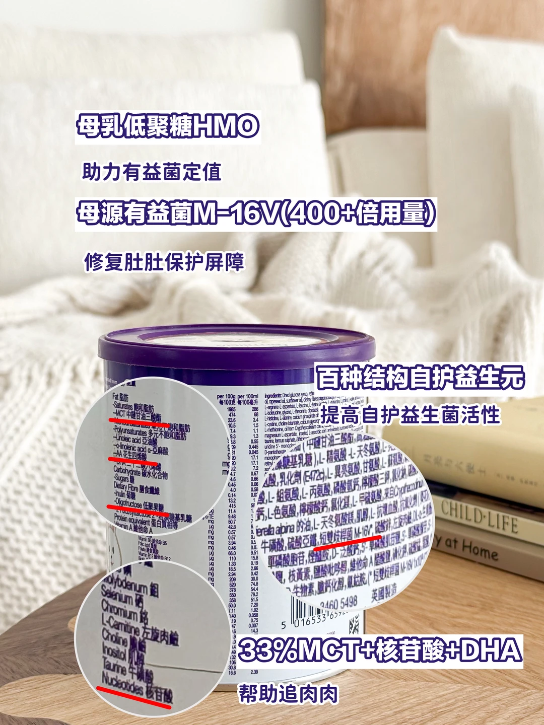 另外,它是市面上少有的同时添加HMO和益生菌益生元的氨基酸配方,同时添加400+倍母源有益菌M-16V和百种结构自护益生元,以及母乳中第三大活性营养物质HMO,可以帮助宝宝维稳肚肚。而且还有33%MCT、DHA/ARA、5种核苷酸,帮助长肉。