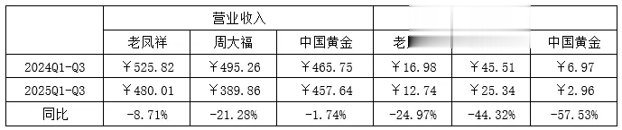 中国黄金作为头部品牌,加盟渠道同样面临规模收缩和效率下滑的双重压力。背后的逻辑也很简单,对于头部品牌来说,传统的加盟模式下利润最高的无非是“品牌使用费”、“管理服务费”等这类加盟“衍生品”,但是在消费性需求萎缩下加盟商的销量上不去,叠加“水贝模式”对行业利润空间的挤压,导致部分加盟商失去销量的同时也无法从利润率中得到补偿,只能接受“优胜劣汰”的自然法则。加盟商的缩减也直接影响品牌商的业绩,同样陷入销量、利润率双降的被动局面。2025年前三季度,老凤祥、周大福、中国黄金三家的净利润分别同比下滑24.97%、44.32%和57.53%。