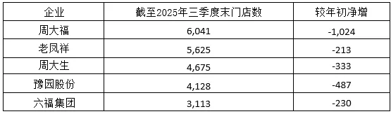 黄金价格持续攀升抑制终端消费性需求,处于产业链中下游的“珠宝首饰加工及销售”行业,陷入了“价格高企→需求萎缩→销量下滑→业绩承压”的恶性循环中,传统的“跑马圈地”式的经营模式宣告失效,头部品牌普遍选择战略性收缩。截至2025年三季度末,周大福、老凤祥、周大生等头部企业的门店数量均大幅缩减,闭店数量超2000多家。