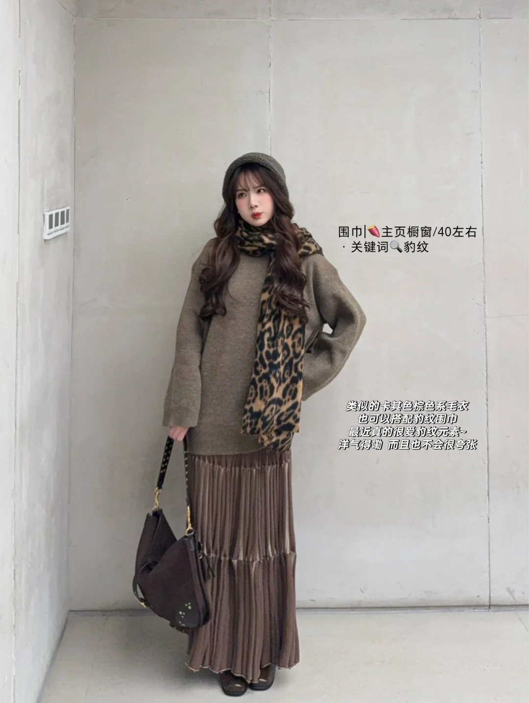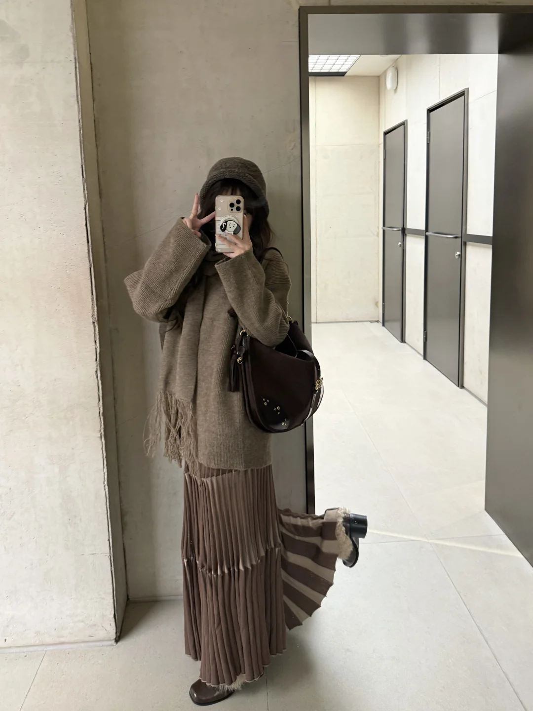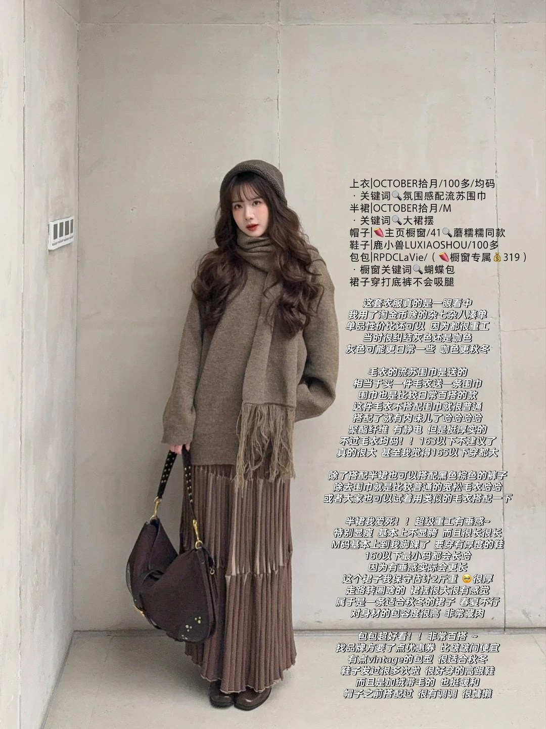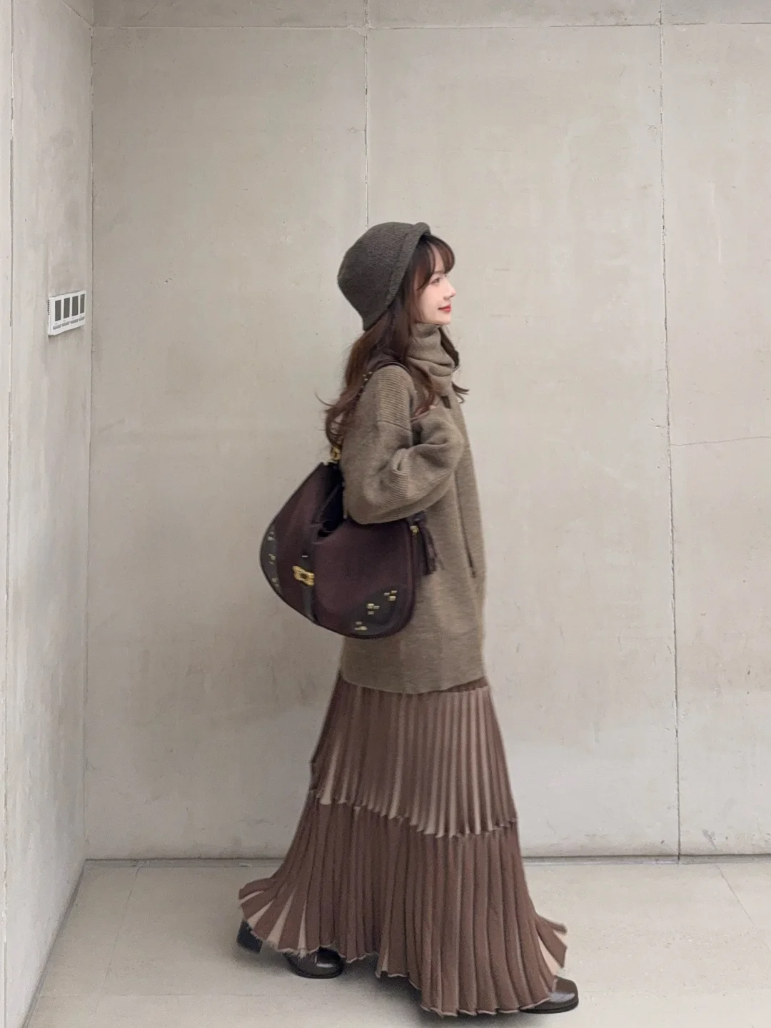 168/104 分享一下这套 带点枯木色系 非常戳我哈哈哈 秋冬虽然经常穿亮色系 但是低饱和度色系还是我的舒适区🫰🏻 单穿内搭➕一件打底衫 下身穿打底裤 估计穿到十度左右 【也可以作为黑色棕色白色大衣的内搭 】 (如果作为内搭 毛衣可以扎一根腰带 更显比例) 这身是私心比较喜欢 所以赶紧拍了分享出来 没什么特别的设计 简简单单 又很松弛慵懒 大裙摆真的特别好看 而且非常遮肉显瘦 这条裙子后面有机会我再多搭配一下 感觉也可以搭配其他毛衣或者皮草之类的 有类似的衣服大家也可以尝试搭配一下~