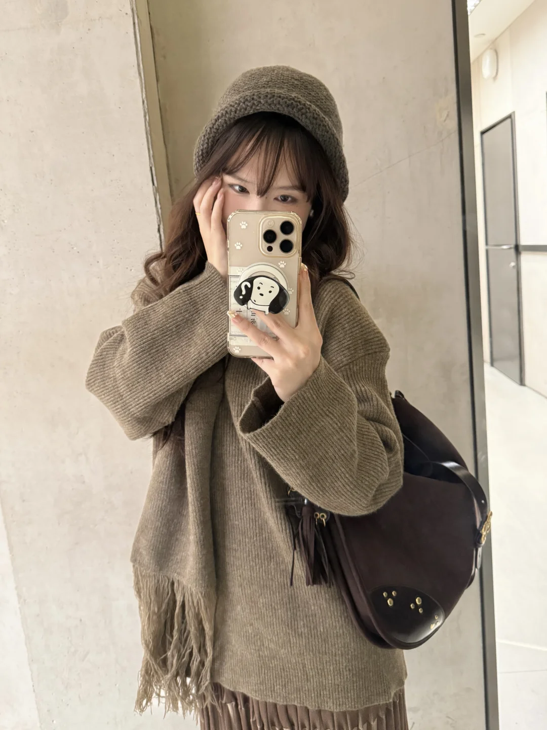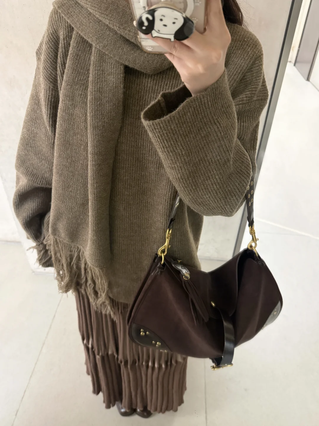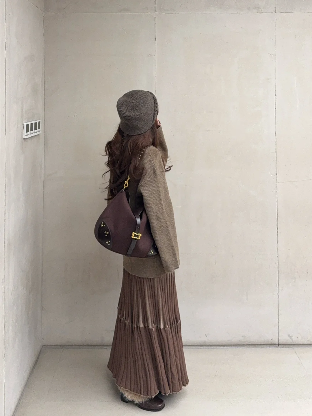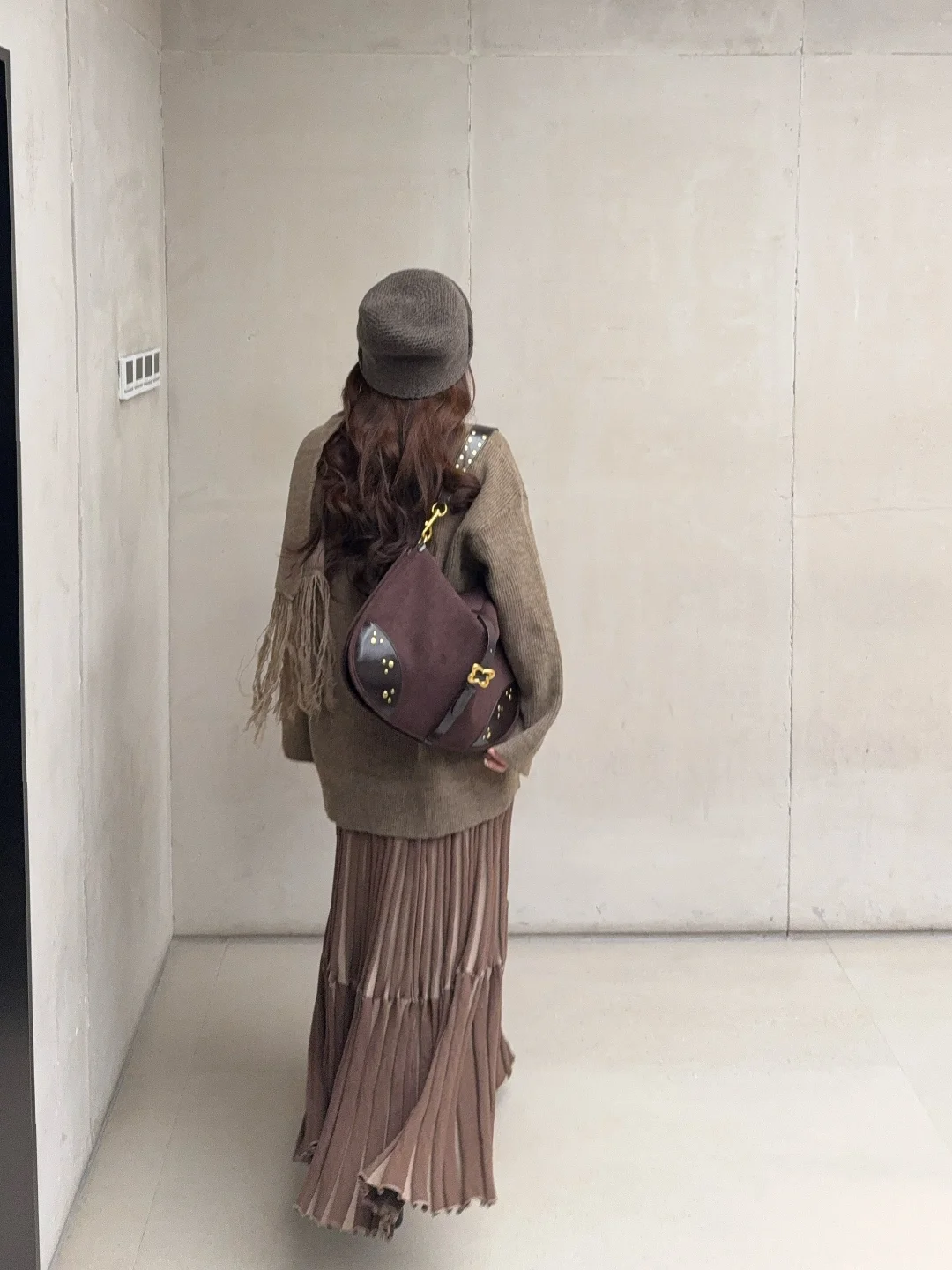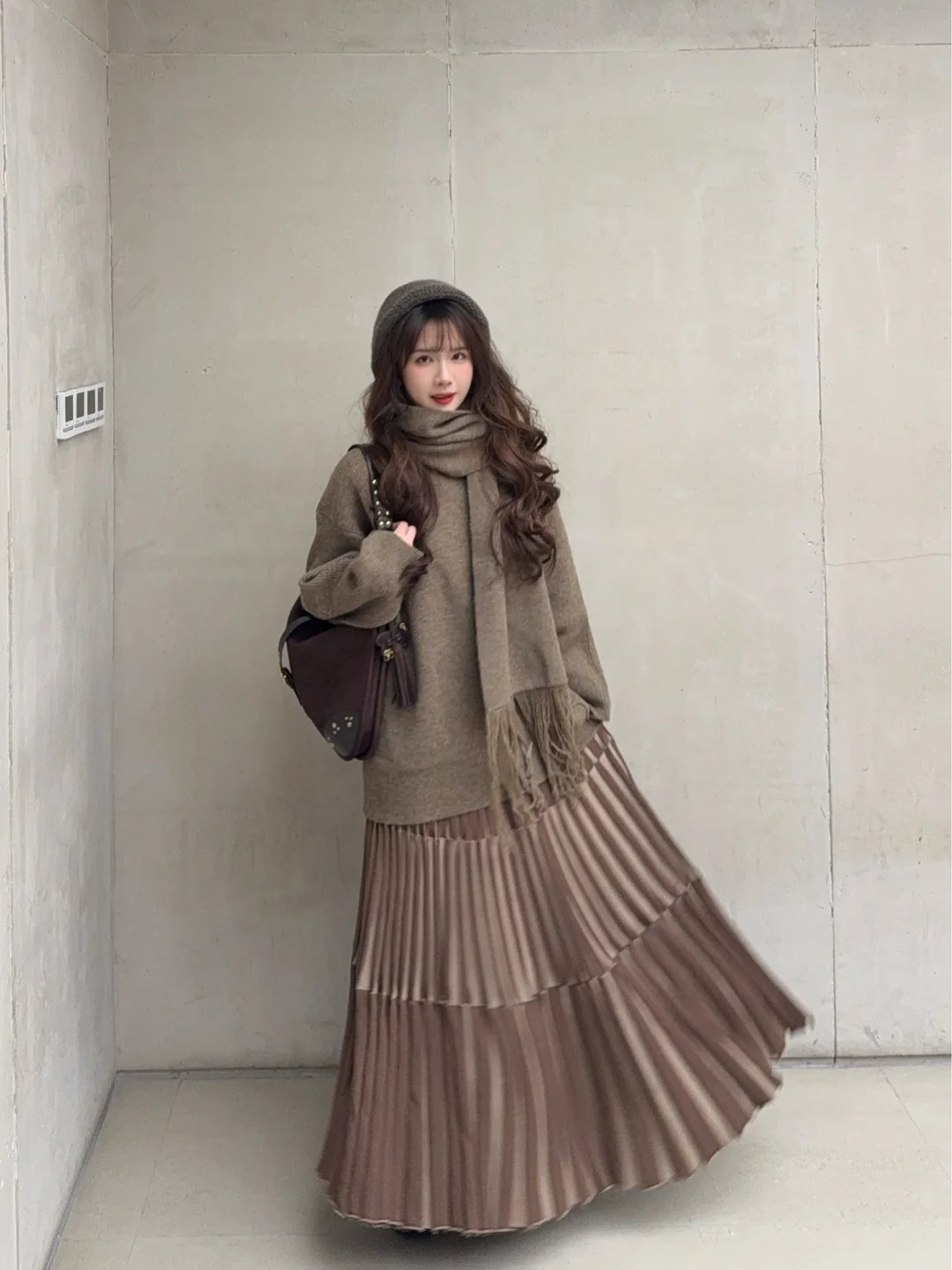 168/104 分享一下这套 带点枯木色系 非常戳我哈哈哈 秋冬虽然经常穿亮色系 但是低饱和度色系还是我的舒适区🫰🏻 单穿内搭➕一件打底衫 下身穿打底裤 估计穿到十度左右 【也可以作为黑色棕色白色大衣的内搭 】 (如果作为内搭 毛衣可以扎一根腰带 更显比例) 这身是私心比较喜欢 所以赶紧拍了分享出来 没什么特别的设计 简简单单 又很松弛慵懒 大裙摆真的特别好看 而且非常遮肉显瘦 这条裙子后面有机会我再多搭配一下 感觉也可以搭配其他毛衣或者皮草之类的 有类似的衣服大家也可以尝试搭配一下~