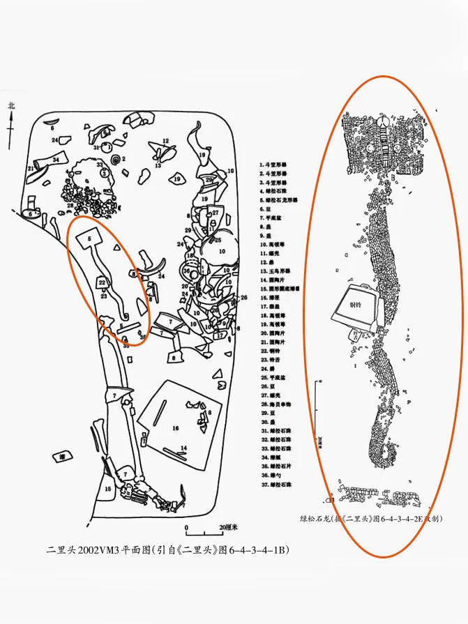 三、绿松石龙形器出土状况介绍。 发掘者许宏先生认为:“这件龙形器应是斜放于墓主人右臂之上,呈拥揽状,一件铜铃置于龙身上,原应放在墓主人的手边或系于腕上。