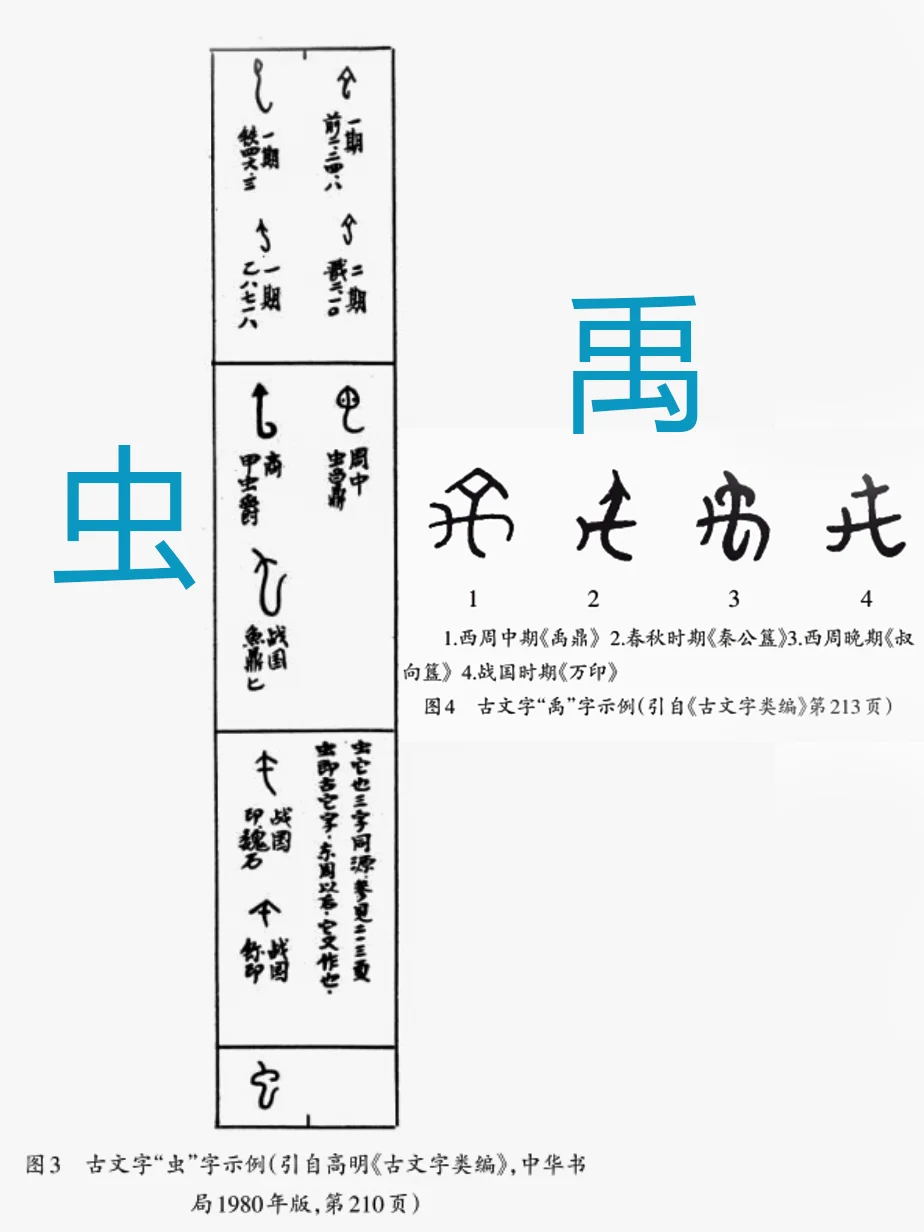 何驽:龙形器原本是墓主用手臂揽在怀里的。在行为动作上表现为将虫(蛇)揽在臂弯中,表现为文字象形便是手臂环抱虫(龙蛇)叠加起来就是金文的“禹”字(图三)。“禹”的抑手臂横直表现出了臂弯,呈怀抱状。这便明确说明二里头2002VM3出土的绿松石龙形器用手揽在怀中的造型,就是“禹”的象征或形象表征。