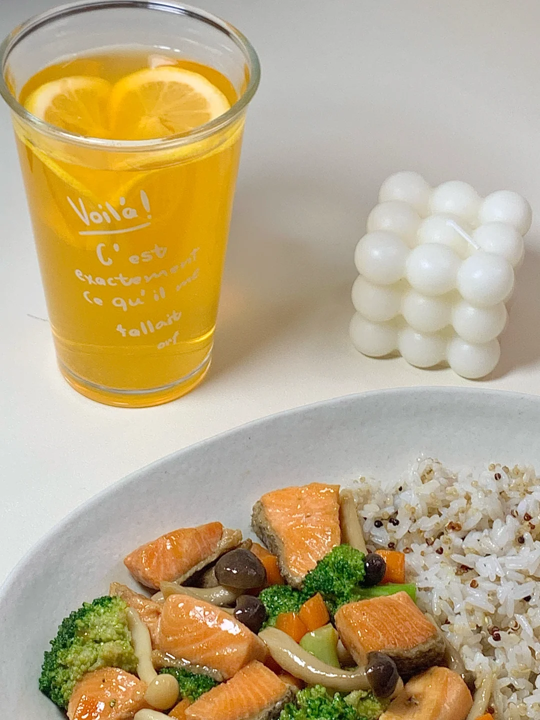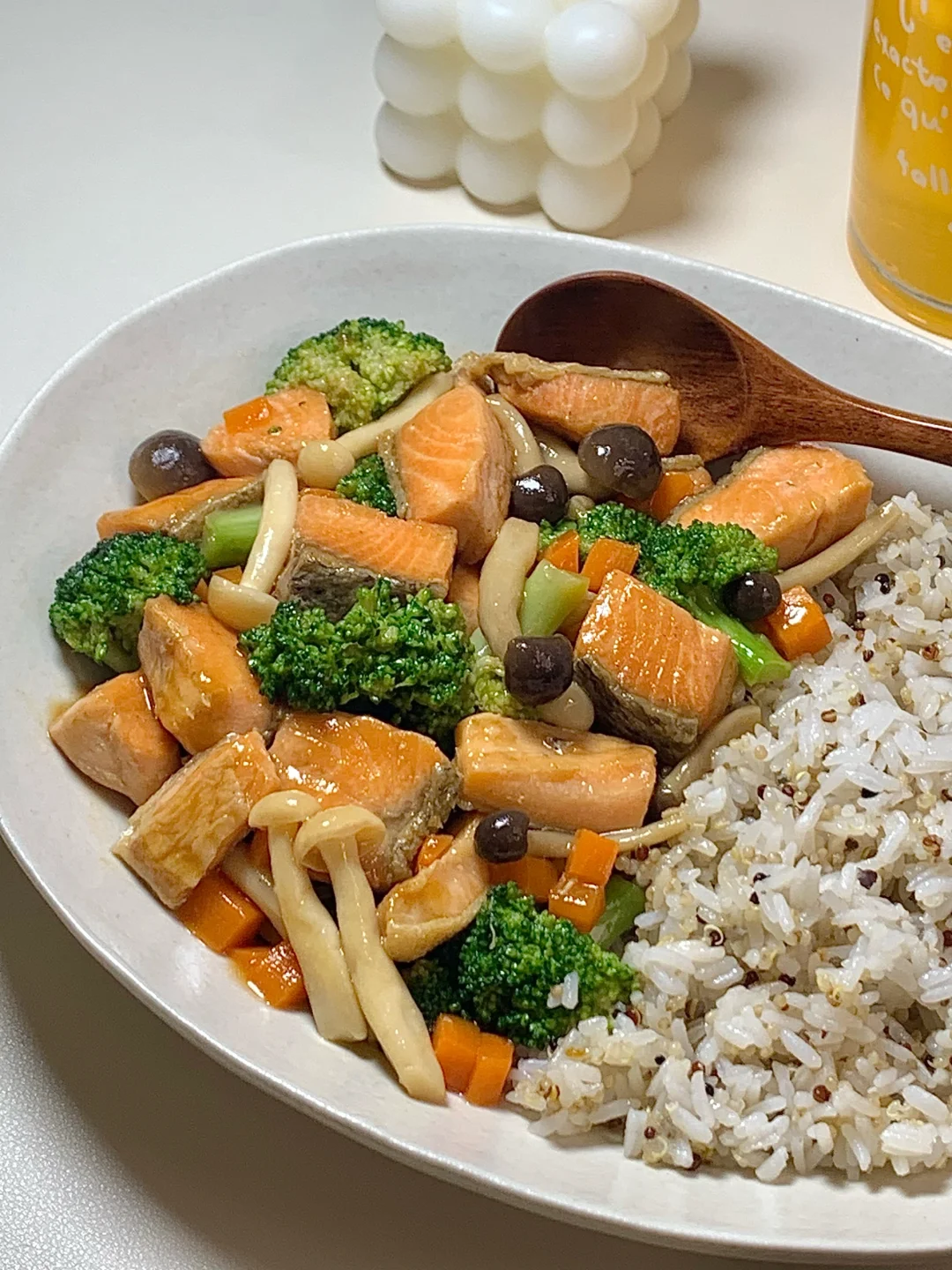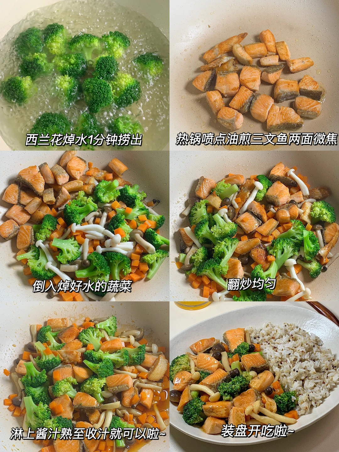 今天给大家分享适合中国胃的减脂餐,三文鱼藜麦饭时蔬菜,减脂也可以开心的吃饭,不用啃菜叶✌️ 📝食材:三文鱼、西兰花🥦、蟹味菇、少许黎麦饭、胡萝卜🥕 ✨藜麦饭 藜麦与大米1:2的比例,电饭煲焖好备用 ✨三文鱼用黑胡椒盐腌制10分钟 ✨酱汁:2勺生抽+1勺蚝油+少许淀粉+适量清水拌匀即🉑 🍃做法:如图所示~