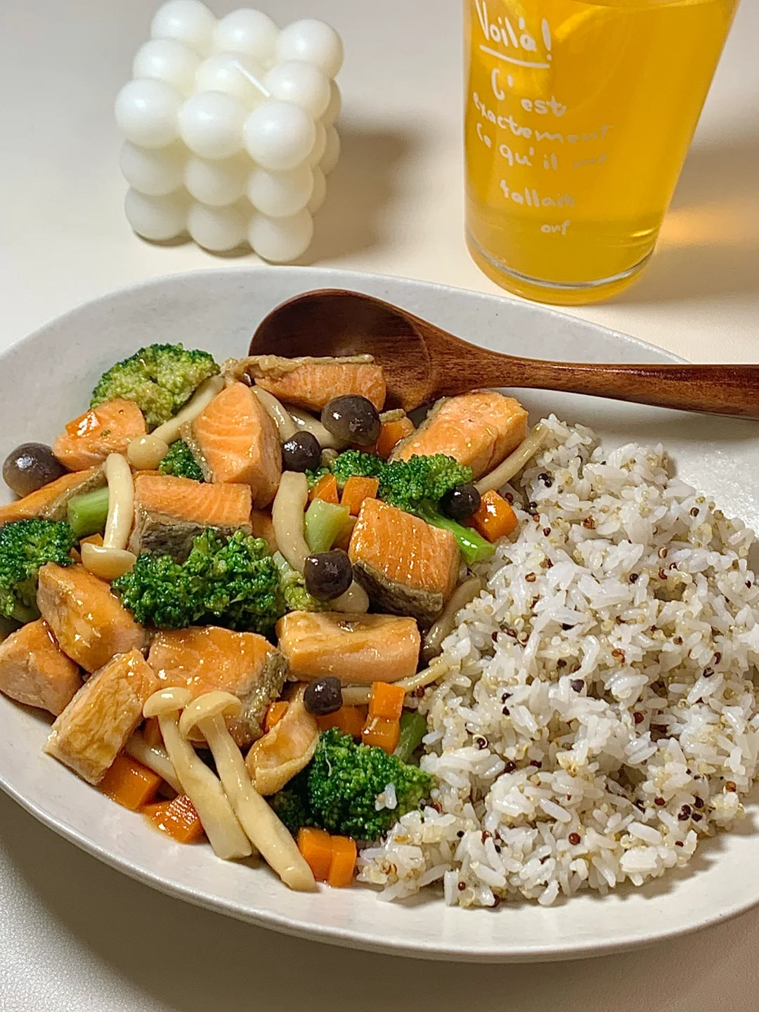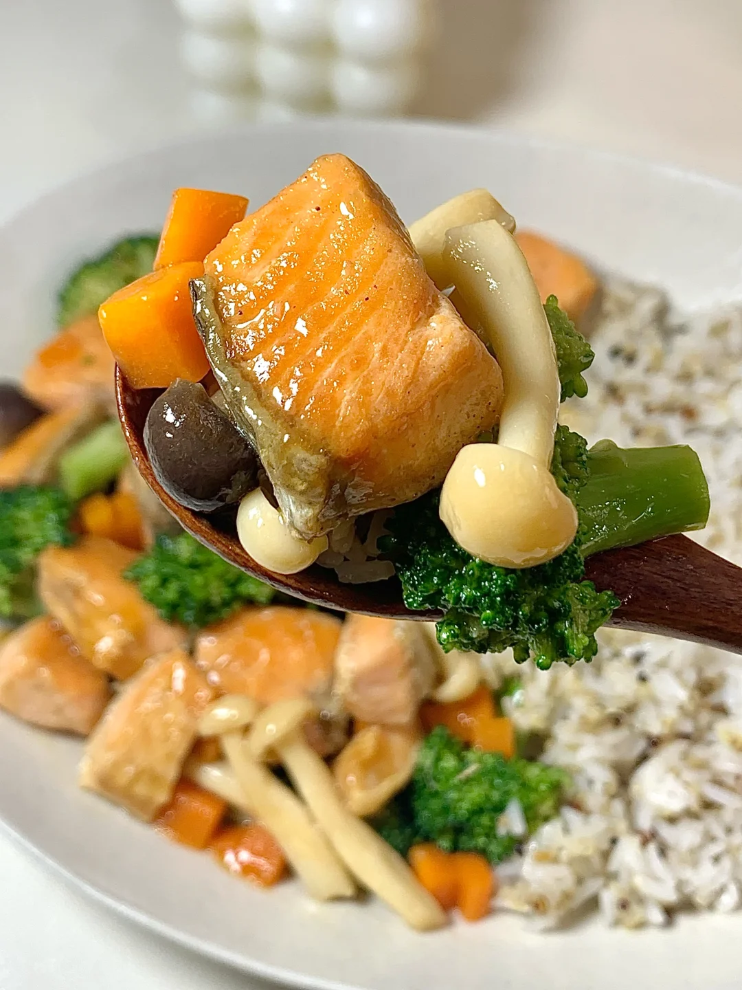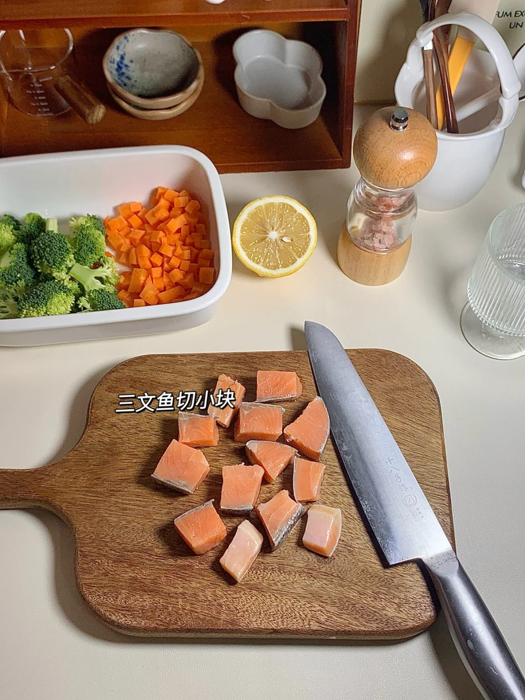今天给大家分享适合中国胃的减脂餐,三文鱼藜麦饭时蔬菜,减脂也可以开心的吃饭,不用啃菜叶✌️ 📝食材:三文鱼、西兰花🥦、蟹味菇、少许黎麦饭、胡萝卜🥕 ✨藜麦饭 藜麦与大米1:2的比例,电饭煲焖好备用 ✨三文鱼用黑胡椒盐腌制10分钟 ✨酱汁:2勺生抽+1勺蚝油+少许淀粉+适量清水拌匀即🉑 🍃做法:如图所示~
