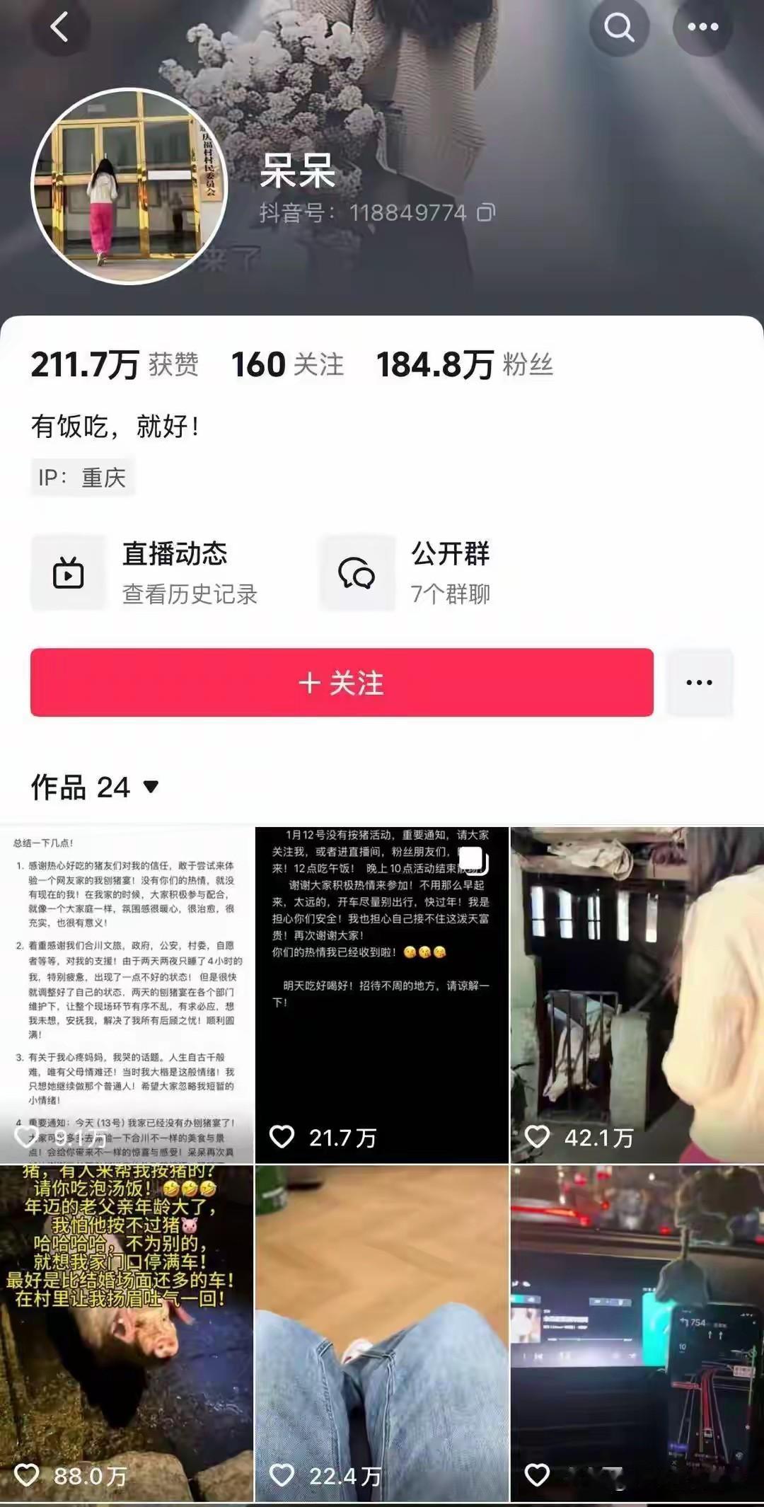 怕是谁也没看懂重庆合川呆呆的操作 说好的只延长一天杀猪宴 半点时间也没拖延 一结束立马关门谢客 直播关了 连门前摆桌子请网友吃席的空地也翻了土 想来换成其他的 早就借助这波流量 日夜开播抓紧变现 又或被某资签约开启带货 但呆呆不同 她或许仍处于“懵”的状态中 我想换成任何一位普通人 一时间也不可能静下来 短短三天个人账号涨粉一百多万 直播期间收到全国各地网友刷的礼物 兑换成人民币 足够许许多多普通家庭为此一辈子 望尘莫及 想来这就是为啥流量“独宠”合川呆呆了原由 果不其然 真诚永远都是必杀技 各地奔赴呆呆家为了“蹭”顿刨猪饭的网友 也正是因呆呆这份独有的真诚所打动 才彼此牵引相聚 说到底 如果每年的春节 每家每户每个村子能如此热闹融洽 不问彼此“收入”“学习”“婚恋状态” 只关心吃饱了没 喝好了没 这个年过快乐没 我想这才是大家过年值得期待事了 你说呢? 记录我的2026呆呆杀猪宴 合川呆呆妹