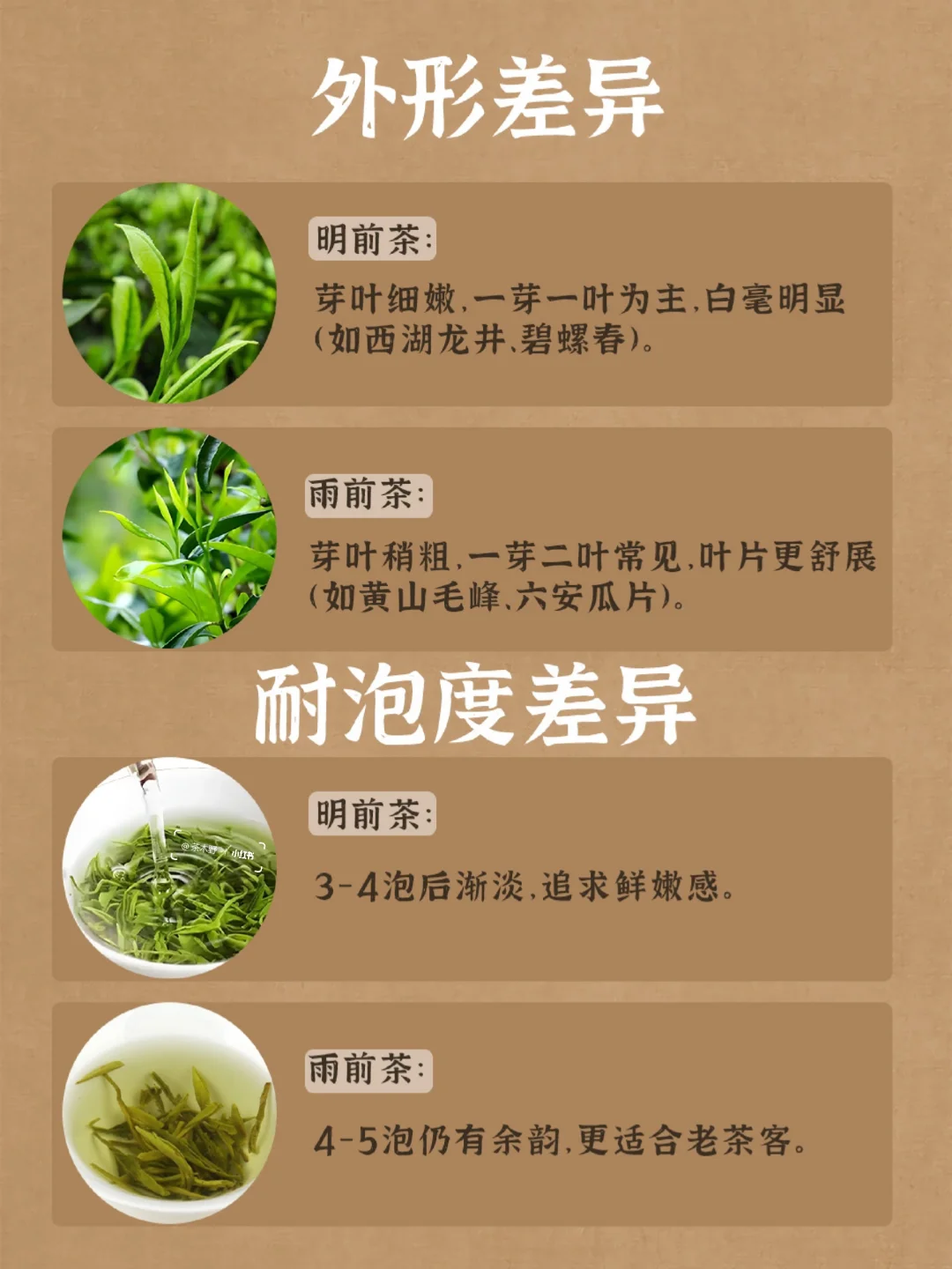 1️看颜色:春茶叶片鲜绿带白毫(像蒙了一层雾),夏秋茶颜色深绿发黄。