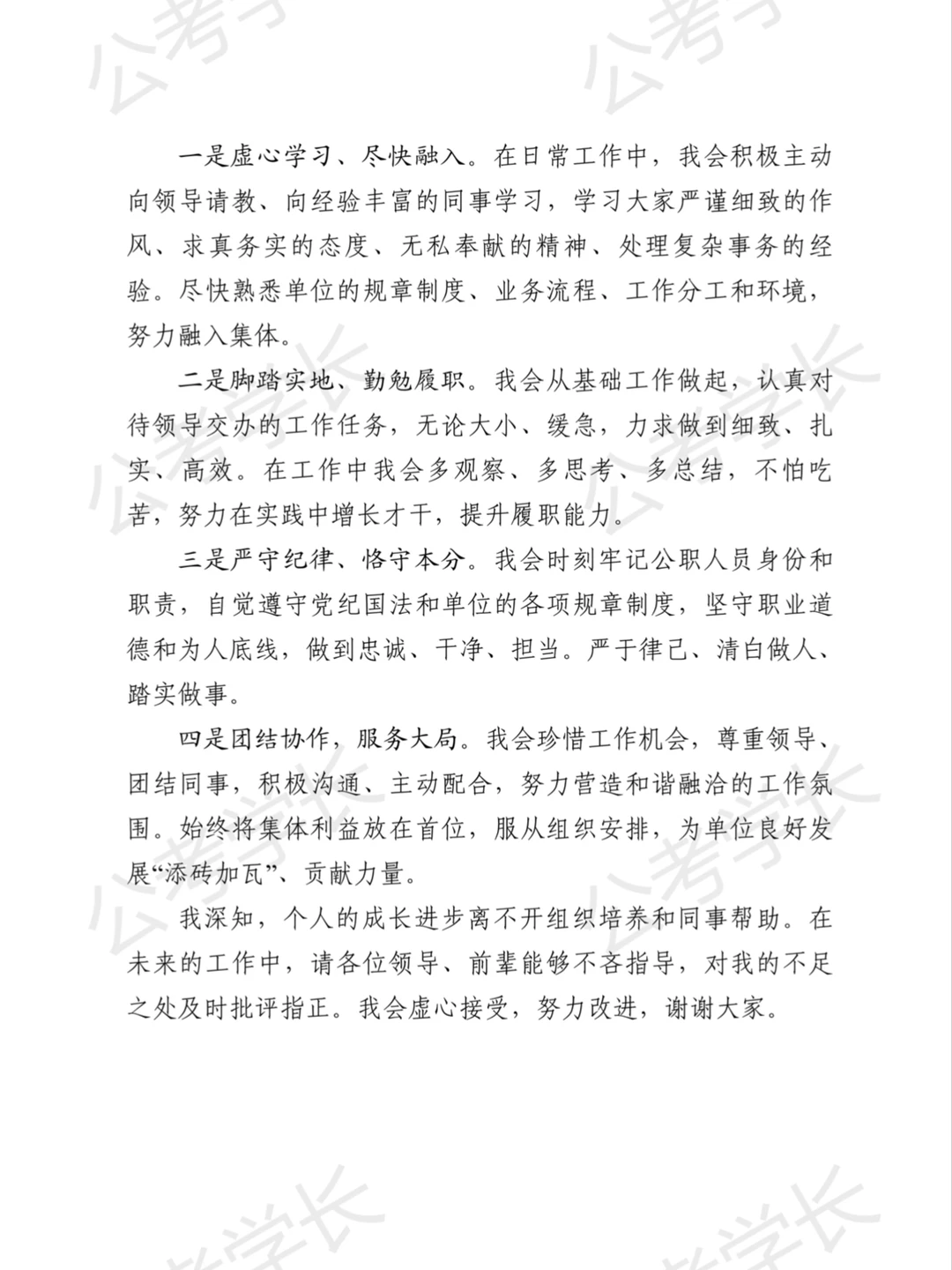 适用场合: 这篇发言稿适用于大多数机关、事业单位对新入职人员在正式的欢迎会、见面会上的自我介绍。 组稿原则:尽量结构清晰、内容全面,既表达了感谢和荣幸之情,也展现自己的教育背景、个人认识、工作态度和决心,符合特定要求和场合氛围。 学长预祝:入职顺利,在新的岗位上取得优异成绩。