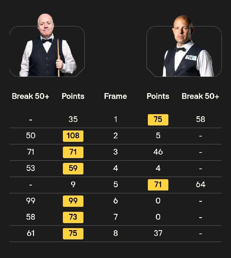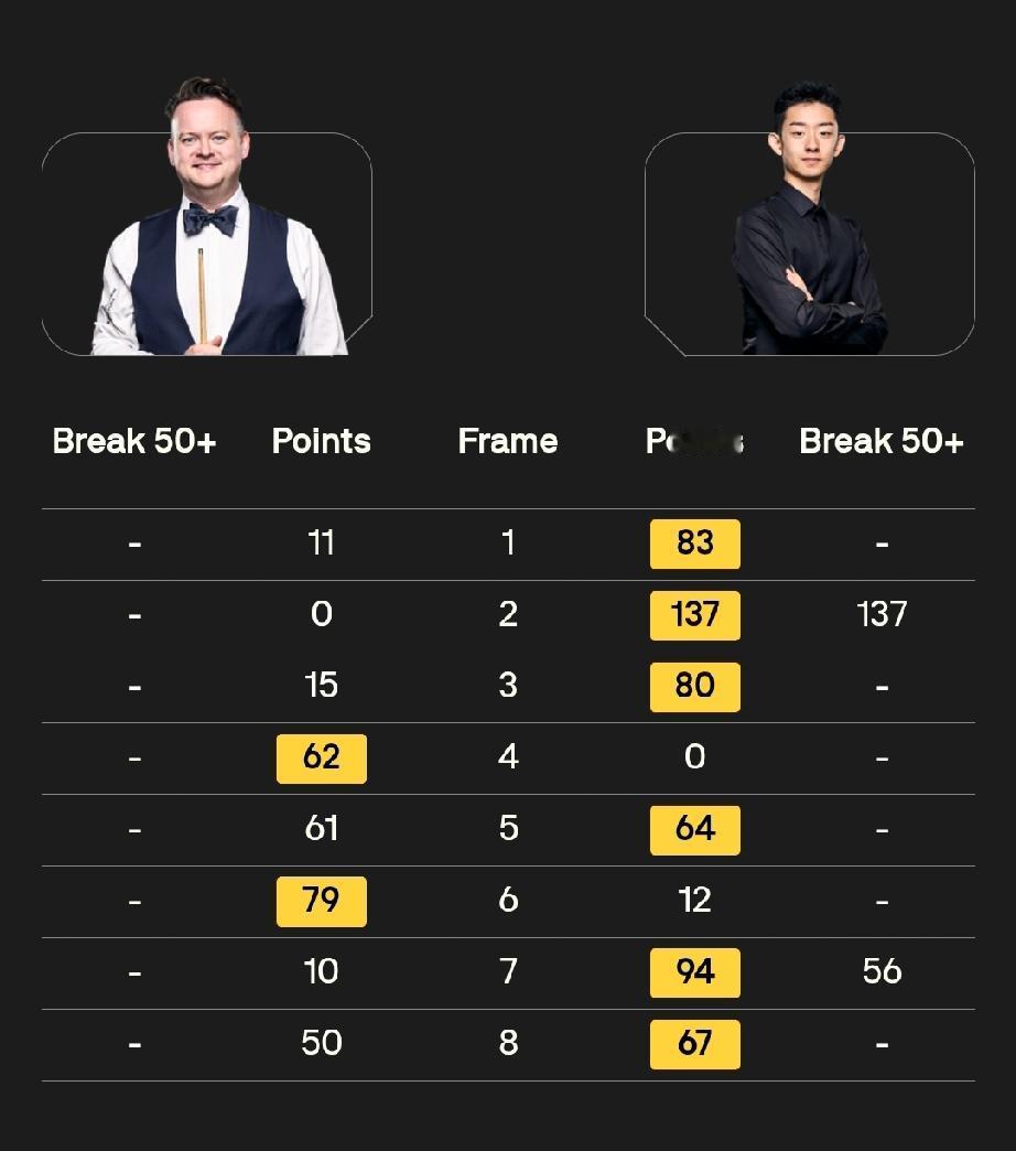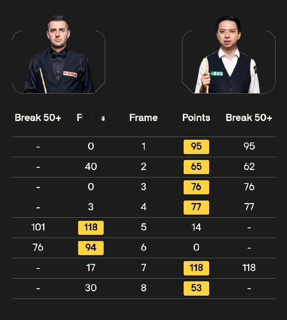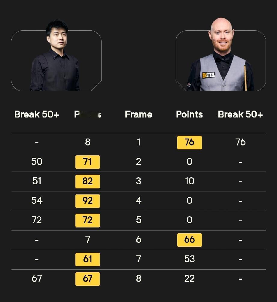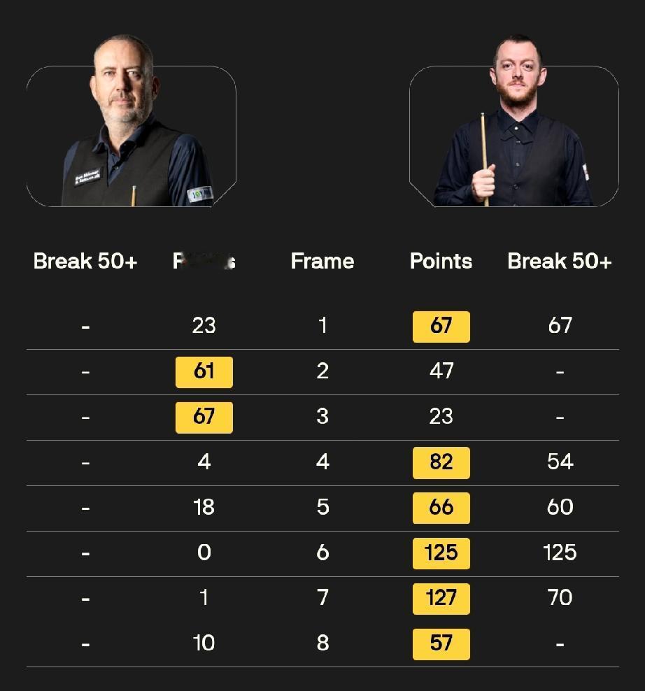 大师赛六场6-2排座次! 斯诺克大师赛,非6-2不能赢球。在已经结束的六场首轮比赛中,比分全是6-2!综合来看,这六个6:2中,马克·艾伦6:2马克·威廉姆斯的整体表现最好,其次是肖国栋6:2马克·塞尔比和凯伦·威尔逊6:2斯佳辉。 马克·艾伦6:2马克·威廉姆斯(五连鞭) 艾伦在1:2落后时连赢五局,打出单杆125、70、60、54等高分,进攻效率极高,而威廉姆斯全场进球成功率仅71%,单杆最高仅36分,几乎被完全压制,是六场中统治力最强的一场。 肖国栋6:2马克·塞尔比(四连鞭开局) 肖国栋上半场连续四杆50+取得4:0领先,全场轰出一杆破百和四杆60+,面对刚拿英锦赛冠军、状态火热的塞尔比,打出碾压级表现,含金量极高。 凯伦·威尔逊6:2斯佳辉(三连鞭+两杠破百) 威尔逊全场打出两杆破百和两杆50+,从第六局开始连轰单杆59、101、105分,一波三连鞭带走比赛,攻防两端全面压制斯佳辉,是六场中火力最猛的一场。 吴宜泽6:2肖恩·墨菲(三连鞭+单杆137分) 吴宜泽首秀就轰出单杆137分,全场一杆破百加两杆50+,而卫冕冠军墨菲一杆50+都打不出来,状态极差,但吴宜泽的稳定性和关键球处理仍略逊于前三场。 赵心童6:2加里·威尔逊(四连鞭+5杆50+) 赵心童前四局击球成功率高达94%,长台成功率83%,打出单杆72、67、54、51、50分,整体非常稳定,但对手加里·威尔逊实力相对较弱,比赛强度不如前三场。 约翰·希金斯6:2巴里·霍金斯(6杆50+) 希金斯长台成功率极高,打出6杆50+,但霍金斯整体状态一般,比赛悬念不大,在六场中属于中规中矩的胜利。