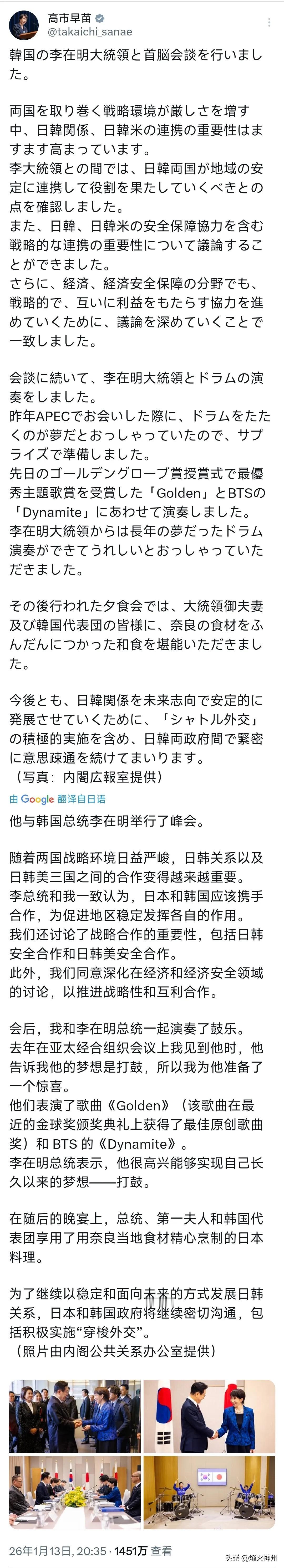 日本首相高市早苗昨晚(1月13日晚)写道:“我与韩国总统李在明举行了首脑会谈。