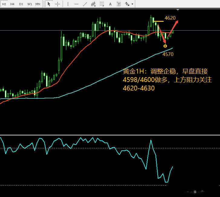 今日周三黄金,凌晨调整下跌4570目前反弹上涨企稳,凌晨下跌到4600后反弹顶部高点压力位置4620位置,早盘可直接再4600附近做多继续上看4615-4620;做空阻力关注4620-4630区域进场;方向明朗;