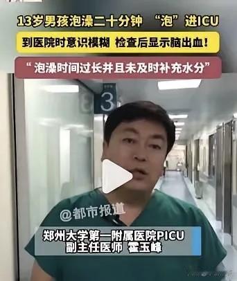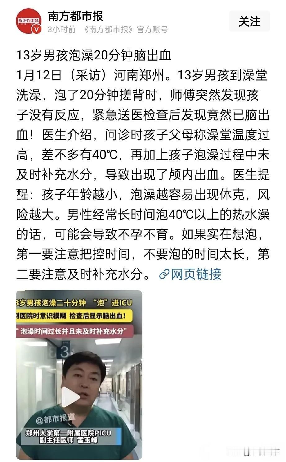 13岁男孩澡堂晕倒,一查竟是脑出血! 河南郑州,13岁男孩独自去澡堂洗澡,搓背师傅的一个下意识动作,竟揪出了一场夺命危机。 师傅掀开浴巾准备搓背时,发现男孩双目紧闭、一动不动,起初以为孩子泡得太舒服睡着了,可指尖刚碰到他的皮肤,一股寒意瞬间爬满后背——那不是熟睡的松弛,而是失去意识的僵硬,连胸口的起伏都微弱得几乎察觉不到。 紧急送医后,诊断结果让所有人倒吸一口凉气:脑出血! 医生的话更是敲响了警钟:40多度的高温澡堂,男孩一泡就是近两小时,全程没喝一口水。高温裹挟着蒸汽,把身体里的水分一点点榨干,血液像被熬稠的糖浆,流速越来越慢。为了给全身供氧,心脏只能拼命加压泵血,偏偏孩子的脑血管还很脆弱,根本扛不住这突如其来的高压,最终不堪重负,血管“爆”了。 看到这里,多少家长后背发凉? 我们总叮嘱孩子“多喝水”,却常常忽略,在高温环境下,这四个字不是提醒,而是保命符。多少孩子觉得“泡澡堂爽”,一进去就舍不得出来;多少家长图省心,觉得孩子大了能自己照顾自己,却不知道危险就藏在这些“习以为常”里。 更揪心的是,男孩至今还没脱离危险。一个鲜活的少年,可能因为一次疏忽,就要和死神抢时间。 这哪里是意外?分明是给所有家庭的一记耳光!别等悲剧发生才追悔莫及,高温天里,不管是泡澡、汗蒸还是剧烈运动,补水这件事,一分钟都不能等! 你家孩子有没有长时间泡澡堂、运动后不及时喝水的习惯?评论区聊聊,别让你的疏忽,变成孩子的遗憾! 脑出血