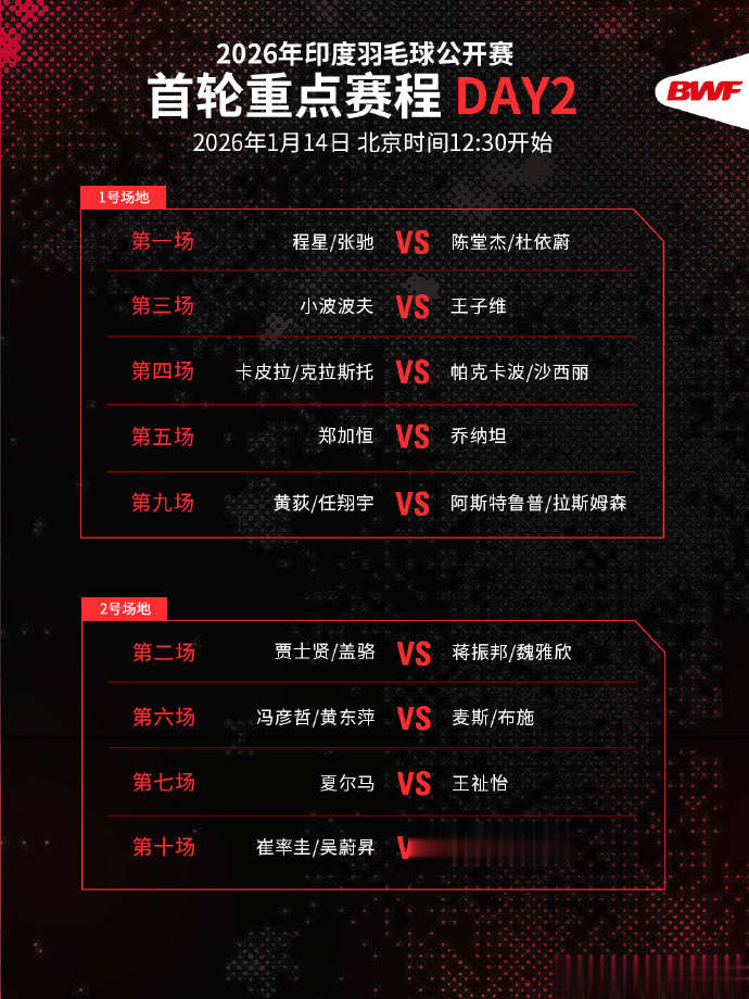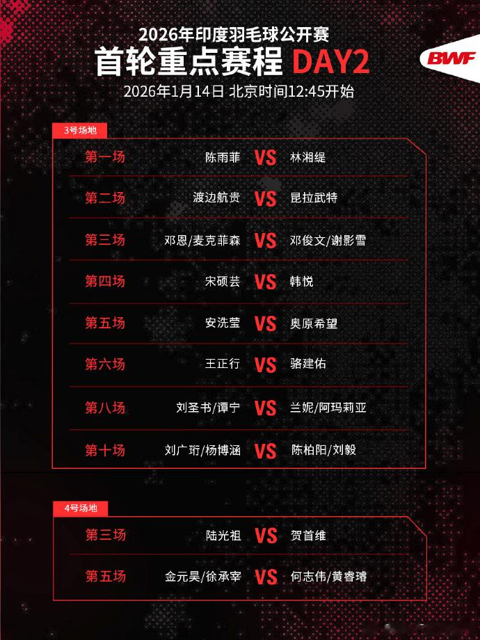 虎扑01月14日讯2026印度羽毛球公开赛将于北京时间1月13日至1月18日举行。在第二日比赛日中,陈雨菲、王祉怡、凤凰组合、安洗莹、圣谭组合等名将出战,比赛将于12:30开打。