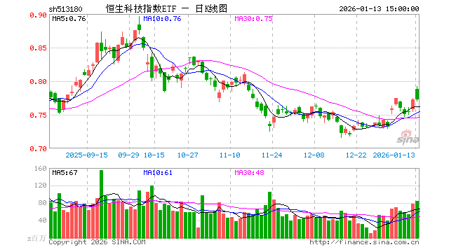 1月13日,恒生科技指数ETF(513180)涨0.00%,成交额66.31亿元。当日份额增加8300.00万份,最新份额为686.37亿份,近20个交易日份额增加41.17亿份。最新资产净值计算值为534.34亿元。