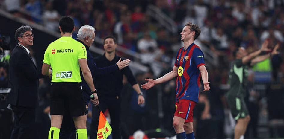 巴塞罗那中场球员弗兰基-德容在第90分钟因对皇家马德里前锋基利安-姆巴佩犯规而被罚下场。