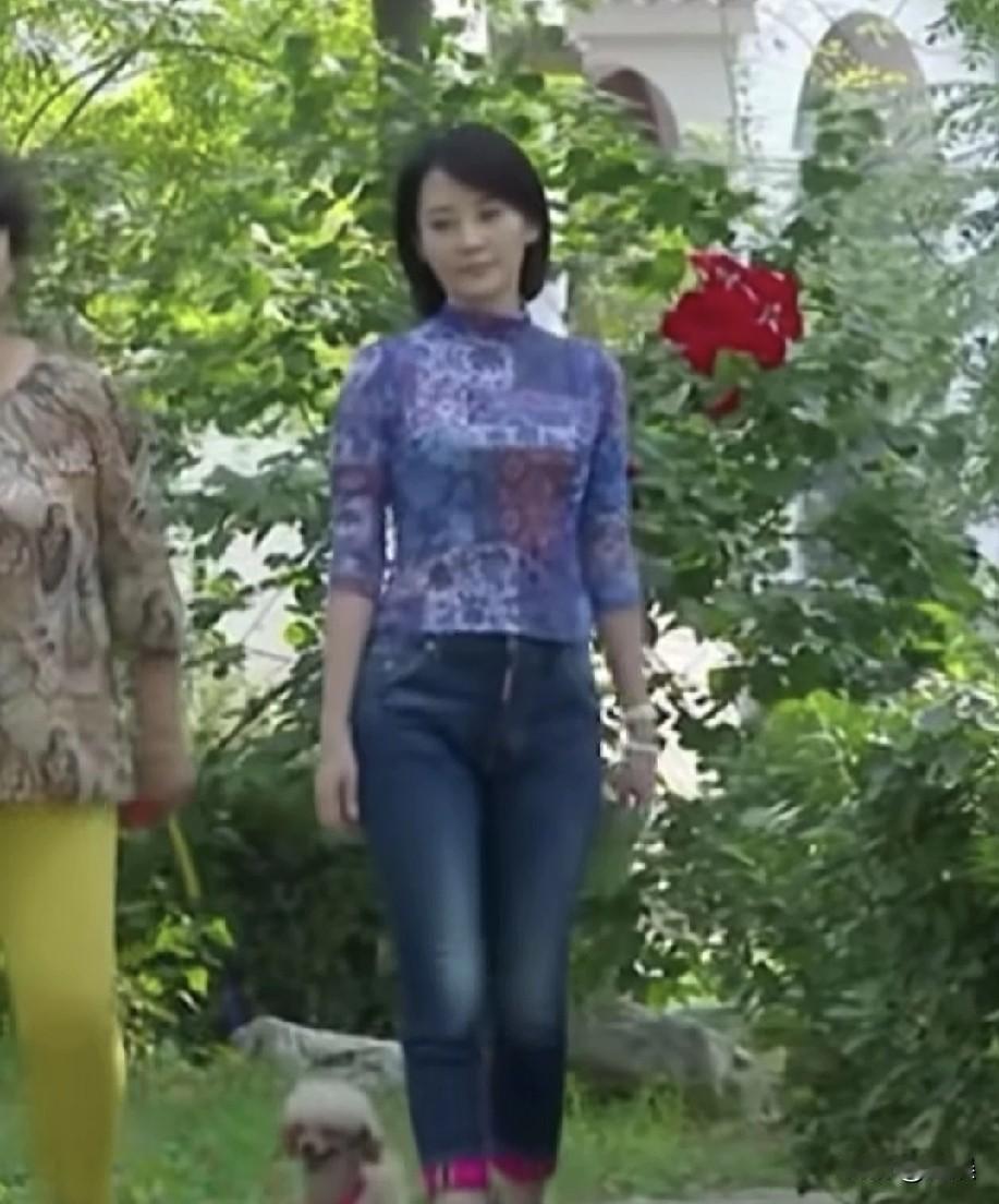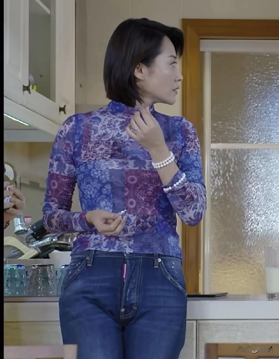 许晴紫色花纹衣,搭配蓝色牛仔裤,简约又亮眼。