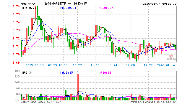 1月14日,畜牧养殖ETF(516670)开盘涨0.28%,报0.711元。畜牧养殖ETF(516670)重仓股方面,牧原股份开盘涨0.02%,温氏股份跌0.06%,海大集团跌0.09%,新希望涨0.00%,梅花生物跌0.10%,大北农跌0.25%,圣农发展涨0.00%,生物股份跌2.02%,天康生物涨0.14%,立华股份涨0.00%。