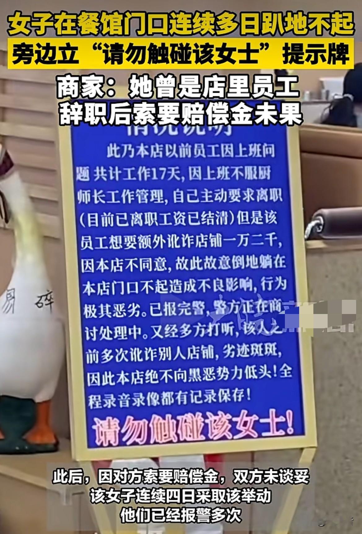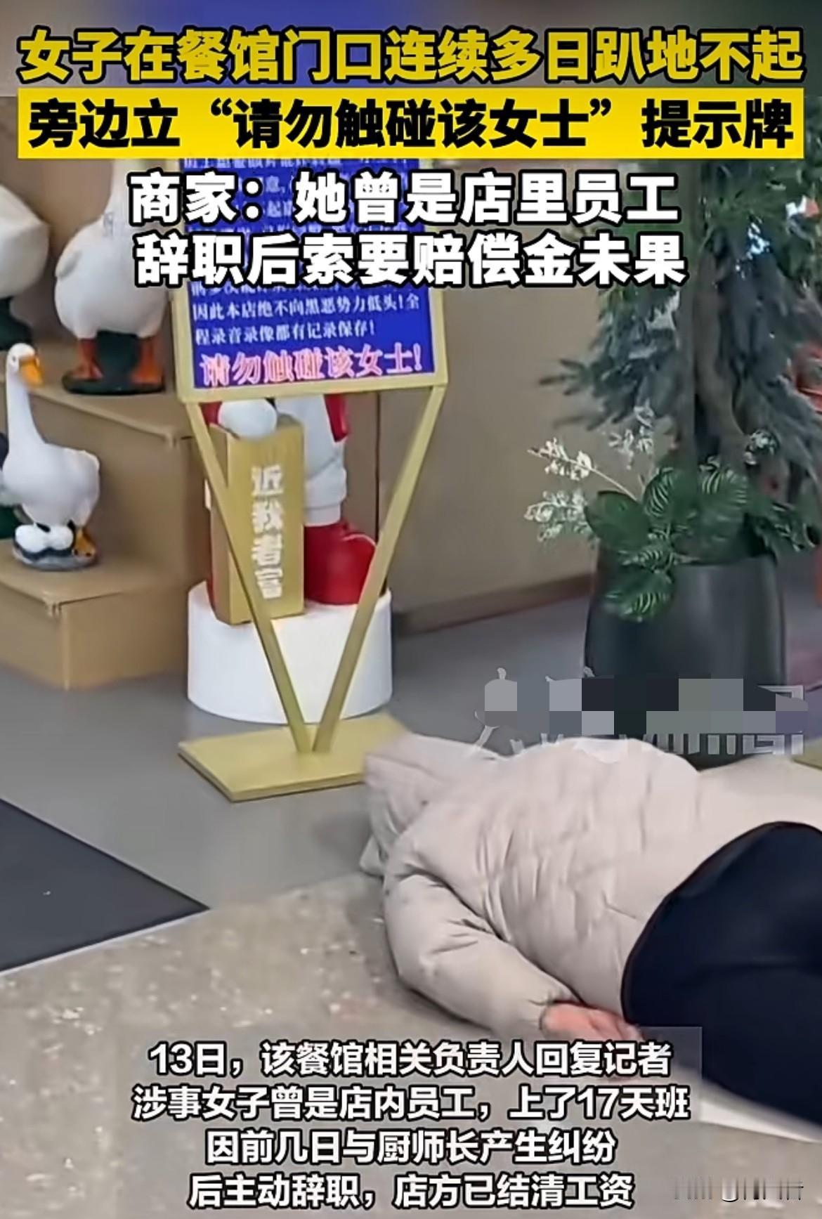 50来岁曾在店里做面食的女子,用帽子盖头连续四天趴在地上。旁边立着“请勿触碰该女士”的提示牌,说明她是前员工,工作17天,因不服厨师长管理主动离职,工资已结清。原来,顾客反映饼不好,厨师长检查发现发酵过度,和她沟通就吵起来了。之后她索要赔偿金,店方没同意。老板说她还想讹诈一万二,且之前就劣迹斑斑。
