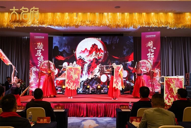 年会在恢弘大气的《大国号角》中拉开序幕!鼓声如雷,震彻寰宇,骏马形象跃然台上,寓意大名府人驰骋市场、所向披靡的侠客风范。一场融合武侠意蕴与现代视觉的演绎,瞬间点燃全场豪情。