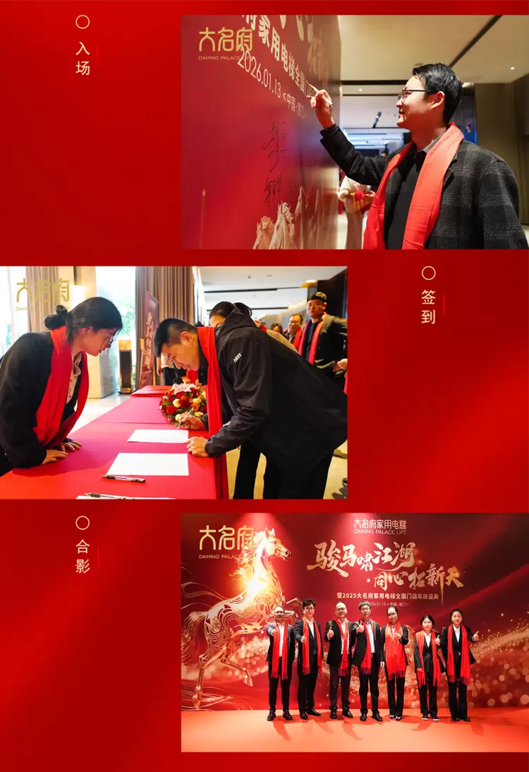 1月13日,大名府家用电梯2025年度全国门店盛典在厦门海沧融信海景华邑酒店盛大启幕!现场旌旗招展、气势如虹,全国各地的英雄豪杰齐聚鹭岛,复盘过往战绩,共谋新岁大计。