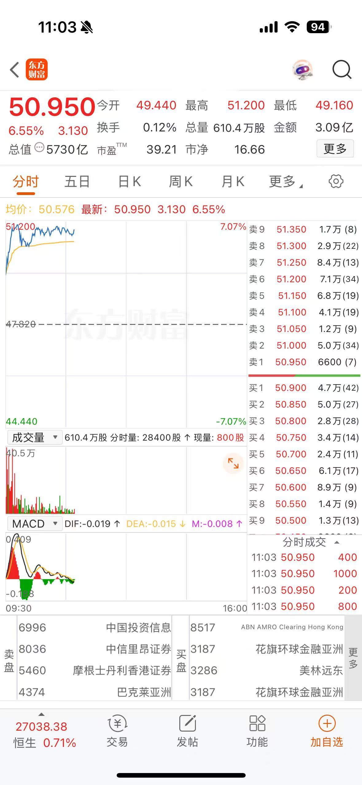 上证报中国证券网讯(记者刘逸鹏)1月14日,农夫山泉一度涨超7%,报51.2港元/股;截至11时03分,该股涨6.55%,报50.95港元/股。