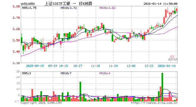 1月14日,截止午间收盘,上证50ETF工银(510850)涨1.21%,报3.775元,成交额1009.63万元。上证50ETF工银(510850)重仓股方面,贵州茅台截止午盘涨0.43%,中国平安涨0.12%,招商银行跌0.15%,紫金矿业涨2.07%,长江电力涨0.26%,兴业银行涨0.57%,恒瑞医药涨0.76%,中信证券涨1.68%,寒武纪涨1.56%,药明康德涨0.47%。